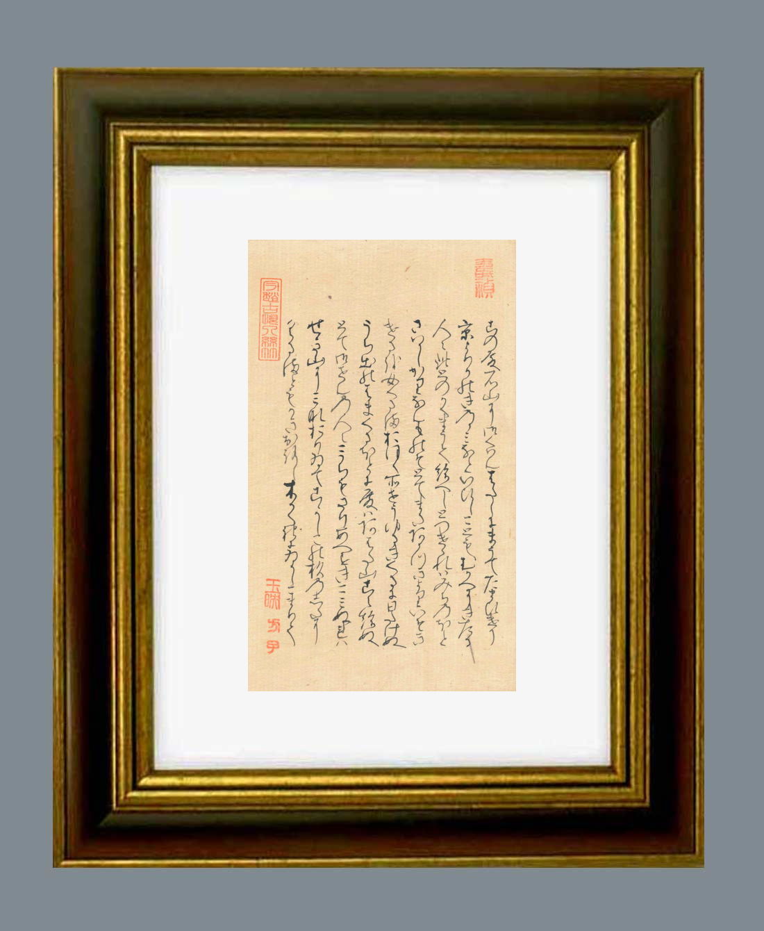 「源氏物語」自筆の大きさ タテ21.8センチ ヨコ12.8センチ。額縁の大きさは タテ37.0センチ ヨコ28.0センチです。額縁は新品です。 |