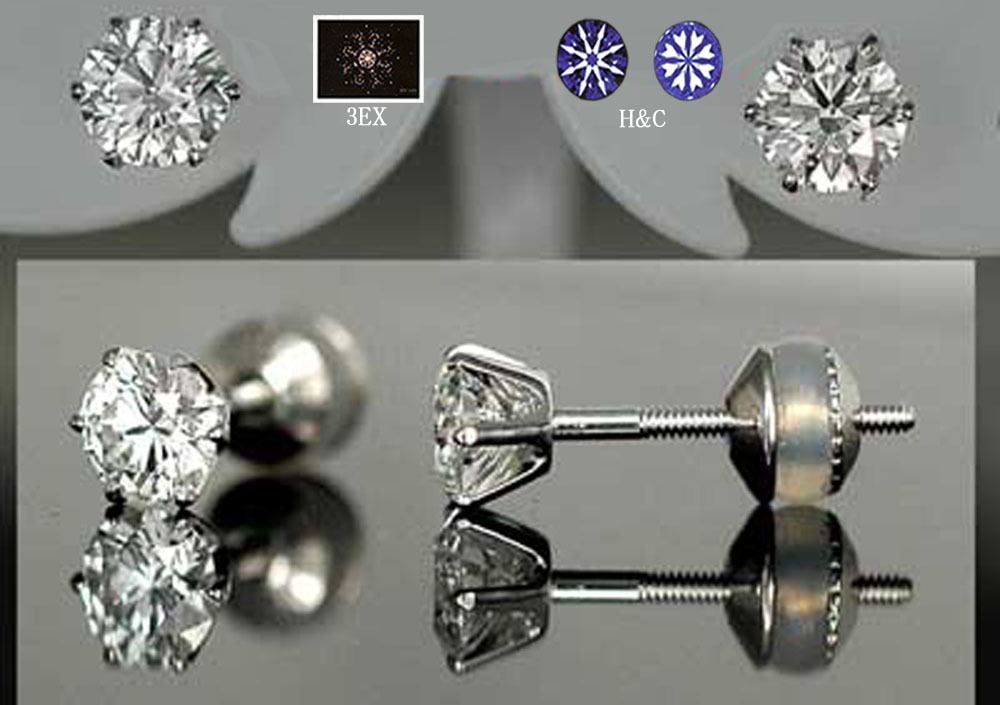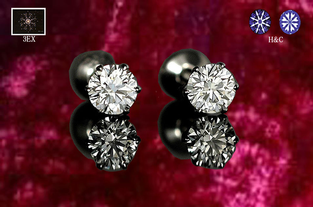 | 【感謝 SALE】お買い得 工房直販特価を更に値下げ ! 無色透明 Eカラー ・クラリティVVS-1 ・最高峰カット3EX H&Cのネジ式ピアス 2石合計 0.662ct!! カラー・クラリティ・カットの全てが最高級の、超ハイグレードダイヤモンドで制作した輝き際立つネジ式ピアスです。 |