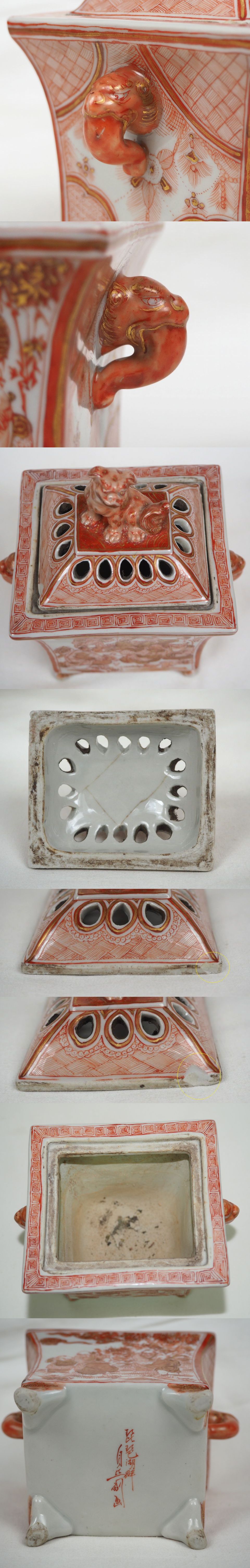 商品説明 | 高さ約 13cm 幅約 11.5×8.5cm ご覧のように、江戸時代後期 彦根藩御用窯・湖東焼絵付師『自然斎』画獅子紐香炉です。目立たないですが、蓋にニュウ、欠けがあります、下の部分は無傷です、詳しくは写真でご確認ください。 |