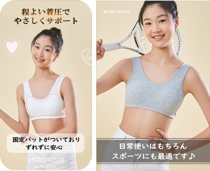 固定パッドが安定しているのでブラジャーがまだ早いキッズのスポーツブラやブラトップに。