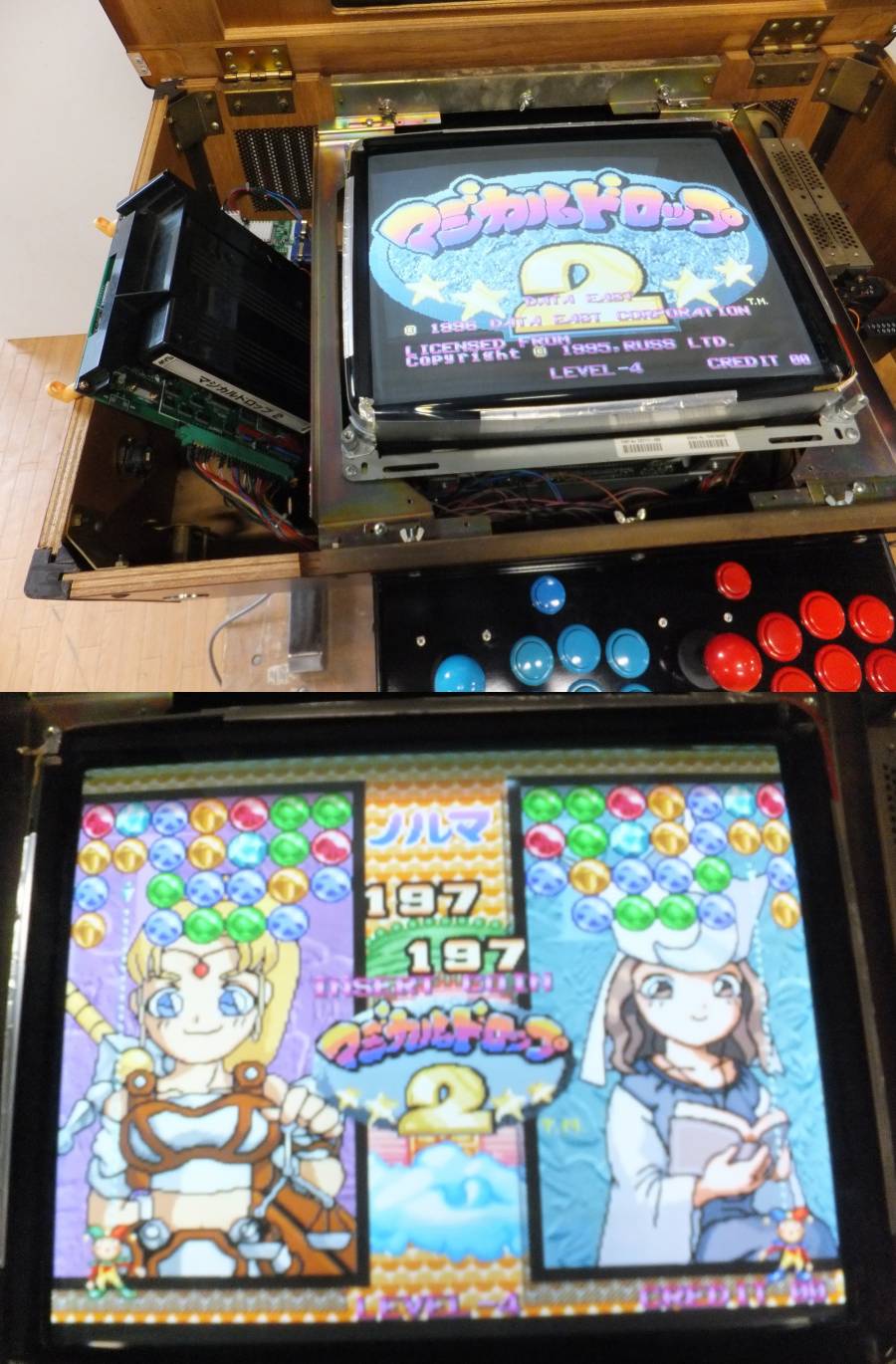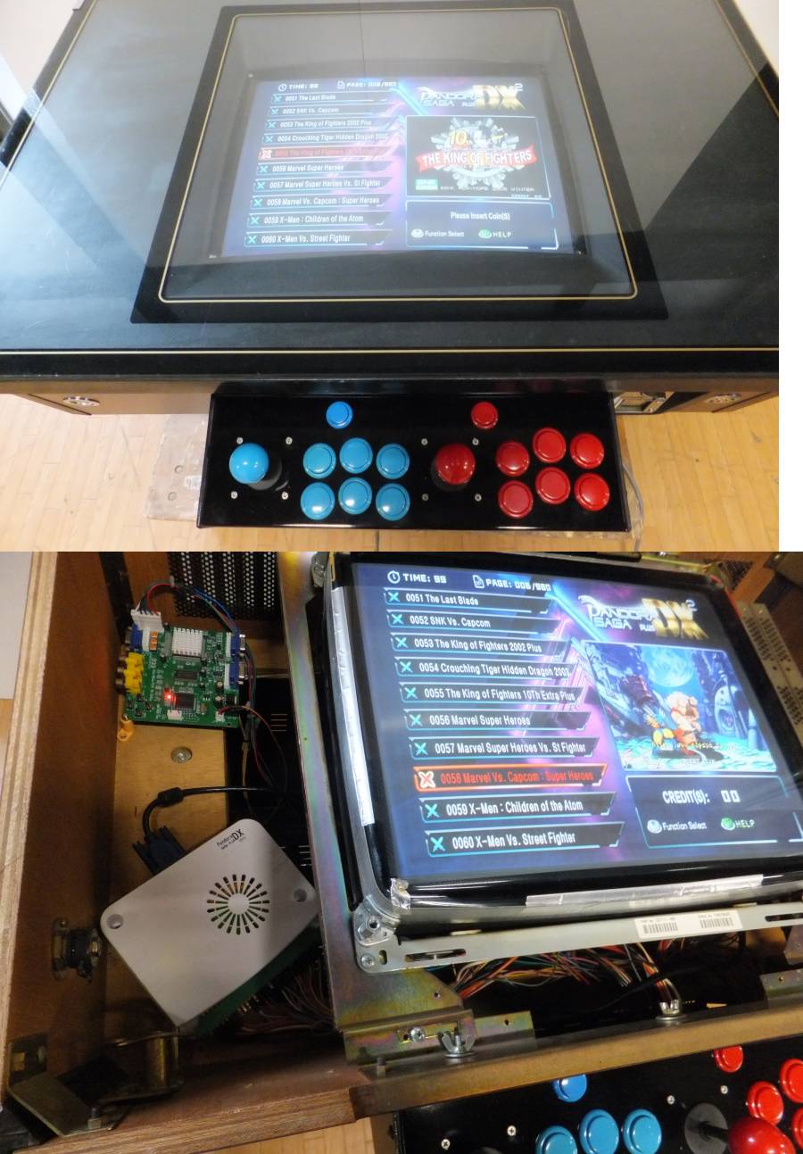 JAMMA配線になっていますので、いろんな基板で遊ぶ事が出来ます。アップスキャンコンバータも取り付けていますので15Khzを表示する基板も使用可能です。(相性があるようで基板によってうまく表示しないものもあります。)