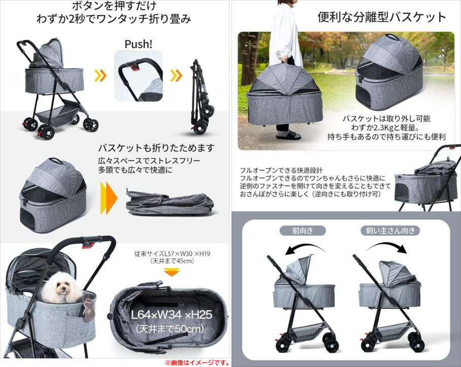 【商品特長】 ◆ベビーカーにも使われる高強度アルミフレームを採用しながら、耐荷重25kgを実現し、軽量化に成功しています。 折り畳み式でコンパクトに収納でき、日々のお散歩がより快適で安心して利用できます。 300Dオックスフォード生地と高強度PUタイヤにより耐久性と軽量性を両立し、大口径タイヤで振動吸収もバッチリ。 全体をアルミフレームで組み上げ、重量わずか5kgの軽量ボディを実現。女性でもラクラク操作可能で、 耐荷重25kgと多頭飼いにも対応します。 ◆ワンタッチで簡単に自立型に折り畳めるデザインで、玄関や車のトランクにもすっぽり収まります。 伸縮ハンドル付きで持ち運びも楽々で、旅行から日常使いまで幅広く活躍。 わずか2秒で折り畳み可能で収納スペースを取らず、伸縮ハンドルでどこへでも楽々移動できます。 収納バスケットと背面ポケットがあり、ペット用品からお買い物グッズまですべてを一手に管理できる便利さです。 また、屋根の開閉が自由自在で、ペットの乗せ降ろしが簡単。ビューウィンドウ付きで飼い主とペットの コミュニケーションも取りやすく、出かけるたびに快適な時間を提供します。 | |||||||||||||