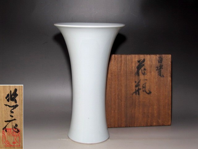 人間国宝 近藤悠三作の白磁花入です。 美しい姿の周囲を引き立たせる存在感ある逸品です。 サイズ 直径18cm/高さ30cm(多少の誤差はお許しください) 状態 一見して疵やヒビ・直しは見られません。 骨董品という事をご勘案頂き、時代経過のスレや、小さな傷がある場合があるかもしれませんのでご承知置きください。 | |||