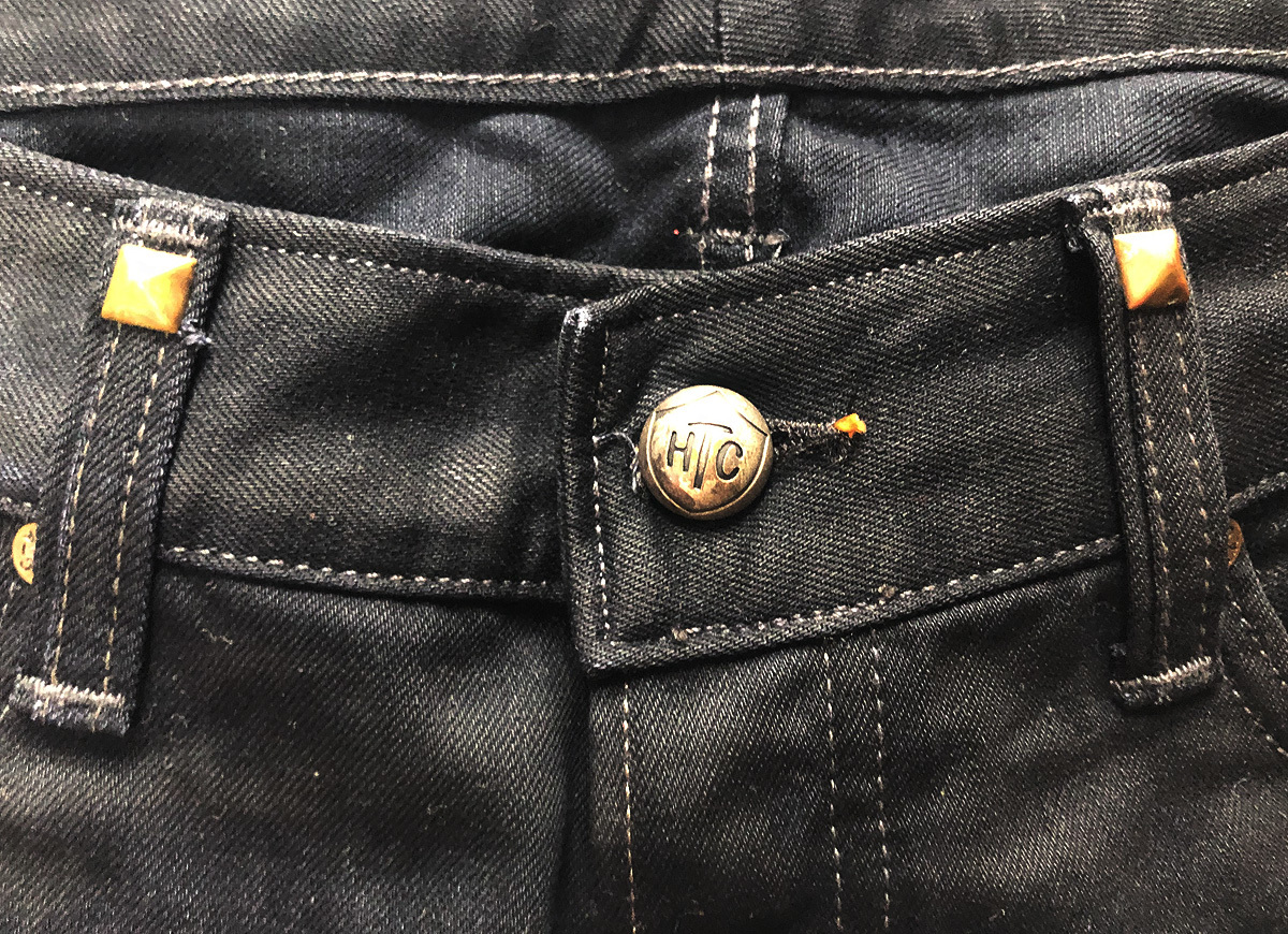 Washed overall, HTC concho buttons. Rivets with logo. Studded logo and leather patch.