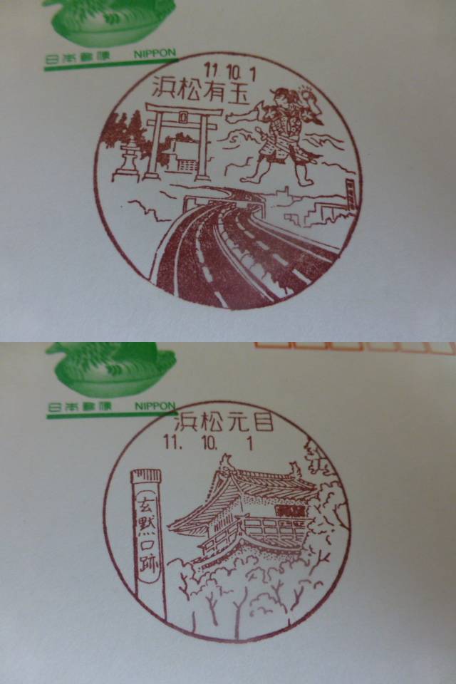 ☆鴛鴦はがき 初日風景印 静岡2枚 浜松有玉・浜松元目 H11.10.1 收藏
