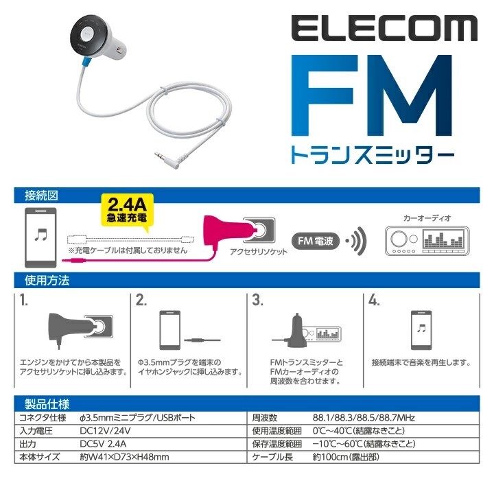 送料無料【訳あり・未使用品】エレコム FMトランスミッター 3.5mmミニプラグ 充電用USBポート付 2.4A■12/24V車対応■ホワイト 收藏