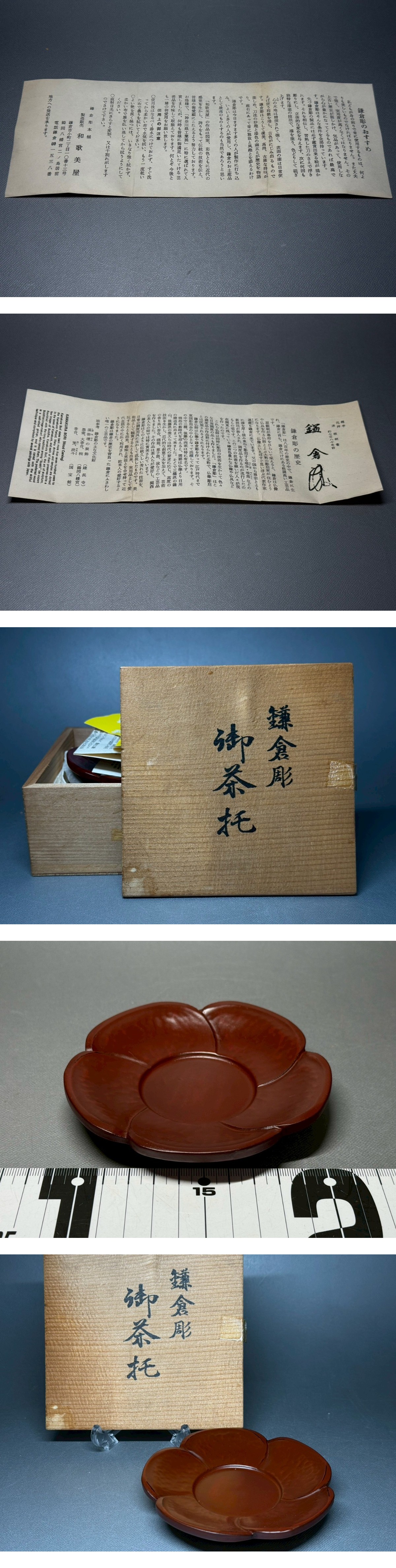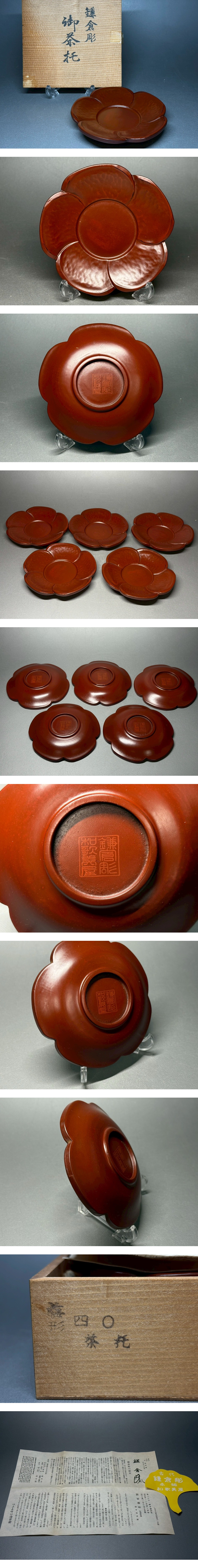 鎌倉彫 御茶托 5客揃 木製 漆器 梅型 古代朱 和食器 茶道具 共箱 骨董 置物 飾物 日本伝統工芸品 芸術 古美術 時代物 落款 在銘1 收藏