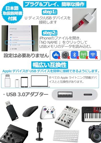 【挿すだけて使える、簡単に使える】:この製品はアプリのダウンロード、Bluetooth、設定、ネットワーク環境を必要としません。iPhone USB 変換アダプタを使用してiPhone/iPadをUSBデバイスに接続するだけで使用できます。製品には詳しい日本語のユーザーマニュアルが付属しています。マニュアルではさまざまな使用方法を紹介しています。