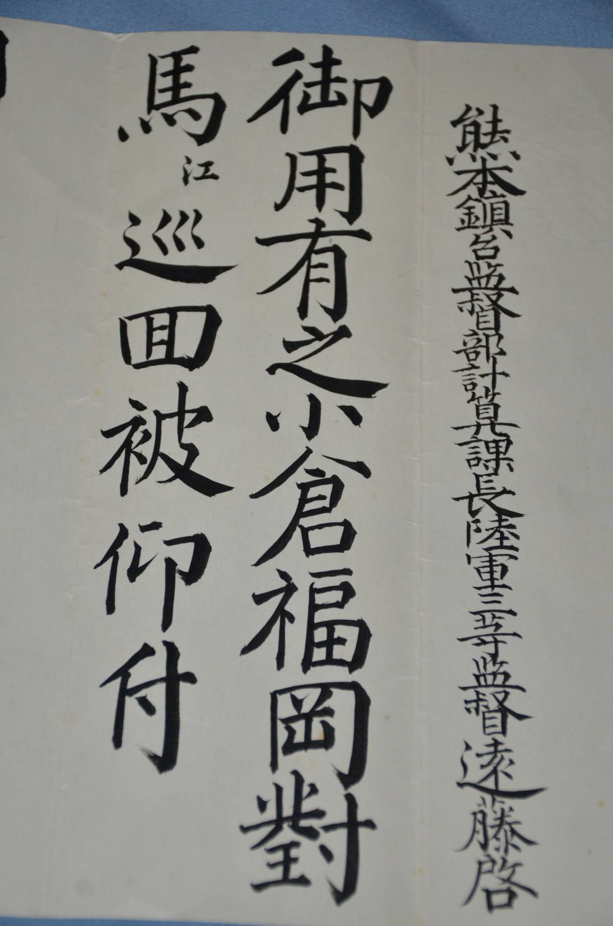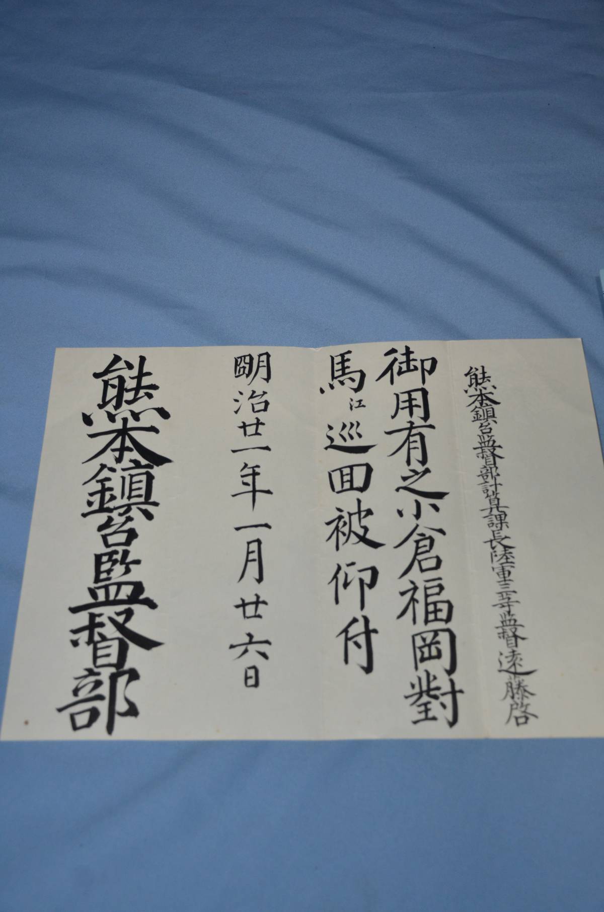 陸軍会計監督、遠藤啓辞令1枚です。遠藤は、明治5年2月陸軍中尉に任官しますが、明治8年会計軍吏に転官し、以降、各部署の会計部長等を歴任します。出品の辞令は、1)御用有之小倉福岡対馬江巡回被仰付(明治21年1月26日 熊本鎮台監督部)履歴資料が付属します。23サイズは、31センチ×センチです。本文下の追加写真もご覧ください。ヤマト運輸ネコポス便で、全国一律210円でお送り致します。円滑にお届けするために、出荷はヤマト運輸に限らせていただいています。「新規」又は1桁の評価の方は、終了24時間以上前に御落札の意志を質問蘭からお入れください。意思表示が無かった場合は、他の御入札の方々に御迷惑をかける場合が多いので、落札後でも削除刺させていただきます。御入札中の方で、「新規」又は1桁評価の方の入札妨害を受けていると感じた方は、御質問蘭で御連絡下さい。回答しますとその方のIDが表記されますので、無回答で対処いたします。