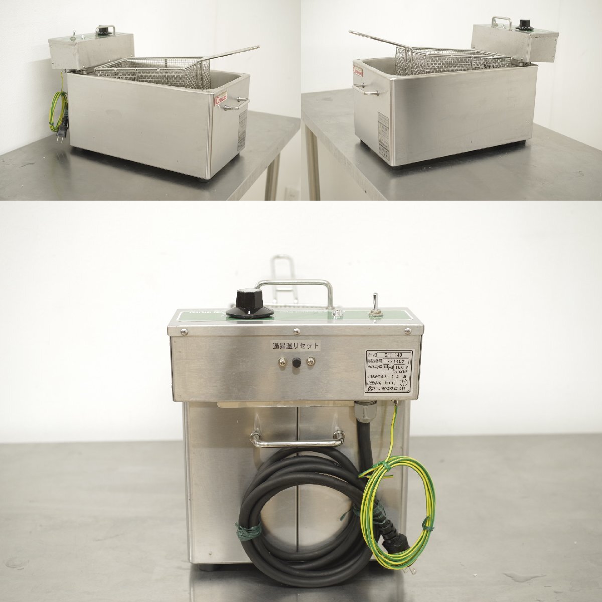 | 【商品紹介】 押切電機より電気フライヤー OFT-140のご紹介です。 ●仕様 ・型番:OFT-140 ・年式:2022年製 ・電源:単相100V ・消費電力:1.4kW ・油量:8L 詳細はこちらから御覧下さい。 付属品は掲載写真に写っているものが全てです。 動作確認済です。 クリーニング済です。 庫内は油による変色がございますが、焦げ付き等はなくまだまだ気持ちよくご使用いただける状態かと思います。 油を取り扱う厨房機器の為、細かな箇所に取り切れてない油汚れが残っている場合がございますので、予めご了承ください。 この他にも商品を多数出品しておりますので、こちらから御覧下さい。 | ||