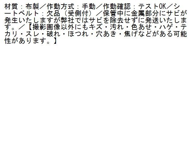 | 商品情報 | 材質:布製/作動方式:手動/作動確認:テストOK/シートベルト:欠品(受側付)/保管中に金属部分にサビが発生いたしますが弊社ではサビを除去せずに発送いたします。/【撮影画像以外にもキズ・汚れ・色あせ・ハゲ・テカリ・スレ・破れ・ほつれ・穴あき・焦げなどがある可能性があります。】 | ||