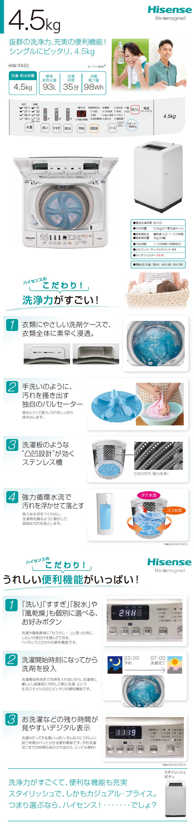 ハイセンス 全自動洗濯機 HW-T45C を出品いたします。 ■特徴■ 使いやすさを追求した、 便利な機能が充実。 スリムボディ ボディ幅、約50cm 一人暮らしで限られたスペースでの使用にも うれしいスリム幅 最短10分。 遅い夜に帰宅して10分で洗濯。 翌朝にはもう着ているかもしれません。 自分だけの選択コース 「洗い」「すすぎ」「脱水」や 「風乾燥」を個別に選んで、 服の素材に合わせたコースを 自分で作れます。 洗剤ポケット 予約時間になってから 洗剤を”泡状”にして投入。 衣類に優しく、素早く浸透。 独自のパルセーター 2種類の羽で、 手洗いのように汚れを?き出す 独自のパルセーター。 ステンレス槽 “凹凸設計”のステンレス槽が 頑固な汚れを落とします。 糸くずフィルター 大きくなったら糸くずフィルターで お掃除は楽になりました。 ■仕様■