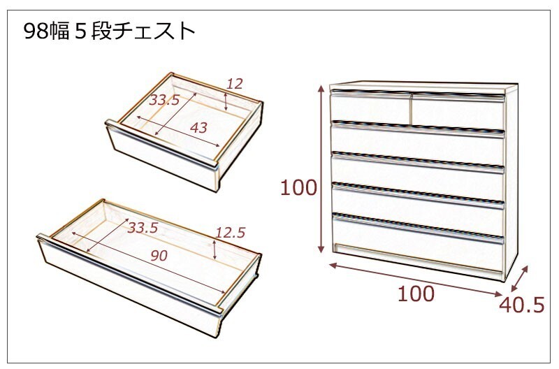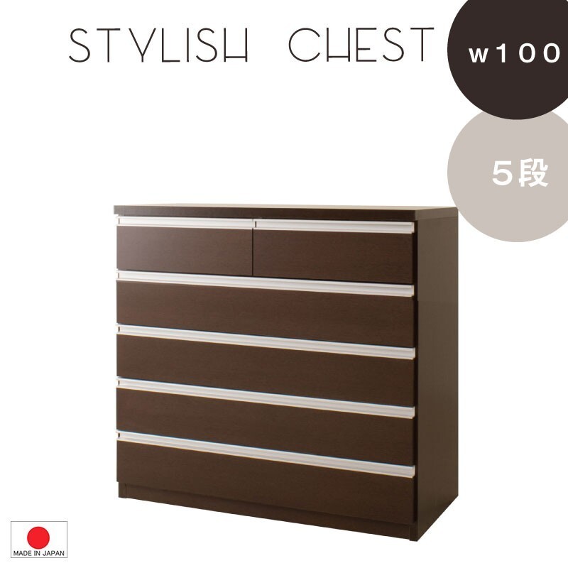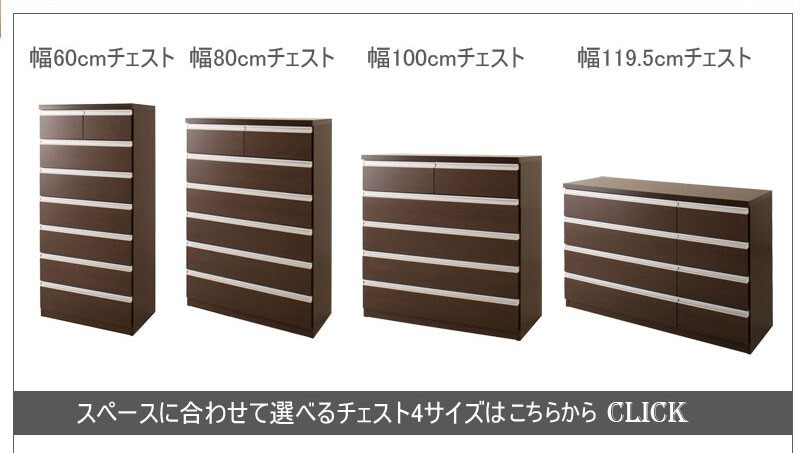 シルバーの取っ手がアクセントになり高級感を更に醸し出します。サイズは60幅・80幅・100幅・119.5幅の4サイズにホワイトとダークブラウンの2カラー。安心・安全の国産の完成品でクオリティーの高いチェストです。安価なものにはレールがなく衣類を入れて使っている内に開閉しづらくなってきた事ってありませんか?当店は安価でもそんな悩みを解消!!大引出し全てにレールを付けて長くご愛用いただけるように、商品開発をしました