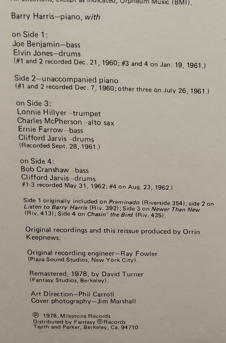 Side 2 originally included on 'Listen To Barry Harris' (Riverside 392)