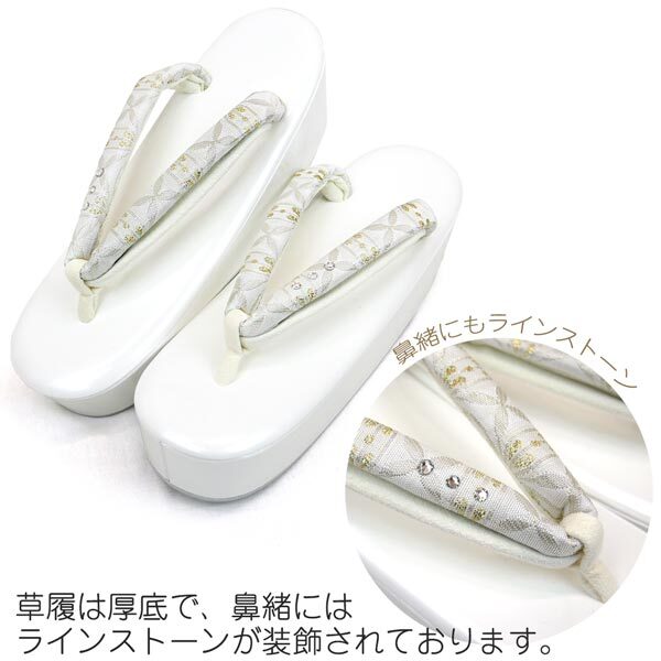 草履はどちらのタイプも厚底草履がセットになっております、厚底草履はお着物姿の立ち姿を一層華やかに演出してくれます。