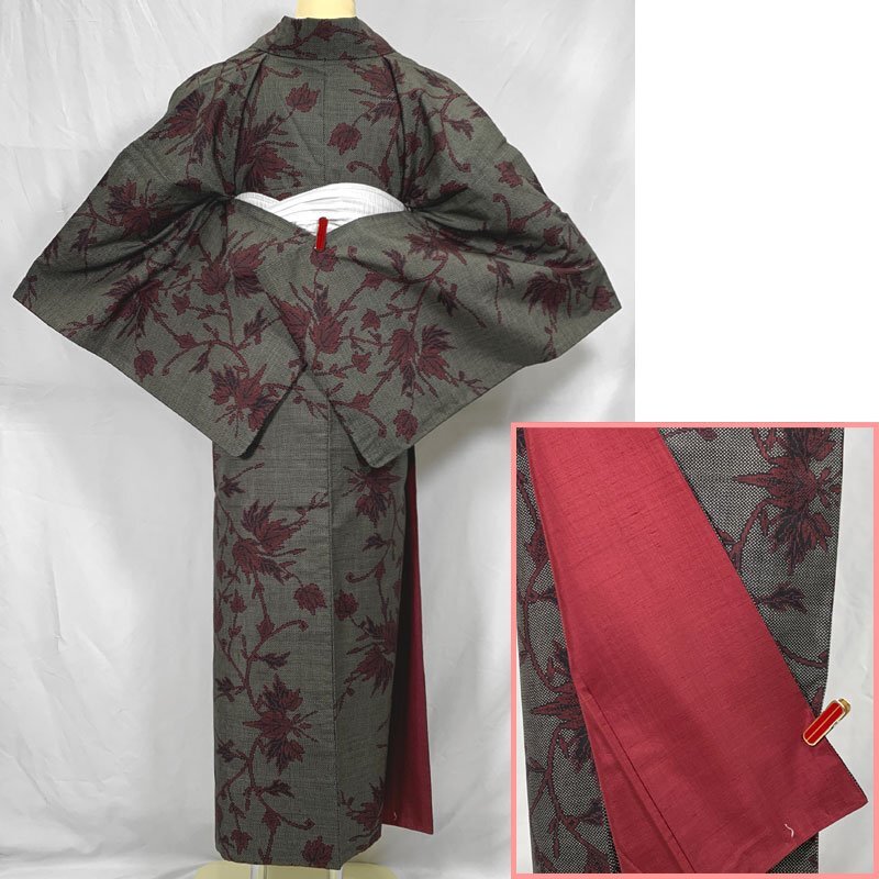| 〇大島紬 モダン クール 黒×赤 葉 植物〇美品 (No.ed) 赤色の葉の文様が織り出された大島紬です。黒×赤のクールな印象ですので、モダンなコーデもおすすめです。 (画像の帯509my78や小物は参考商品で、本品には含まれません) 右内袖にシミがございますが、地の色が濃く紛れているので近くでよく見ないとわかりません。衿裏や胴裏にスナップボタンの跡がございますが、着用の際は見えない部分です。 【表地素材】正絹 【色】黒、赤 *モニターによって色味は実際と異なる場合がございます。 【サイズ】裄:65.5cm、丈(肩から):165cm、袖幅:33.5cm、袖丈:53cm、前幅:23cm、後幅:29.5cm、裄の縫込み 身頃側:2cm、お袖側:1.5cm、内揚げ幅:-cm *素人採寸のため、多少の誤差はご容赦ください。 上質な逸品ですので、いかがでしょうか?よいお品物でお勧めです^^ | |