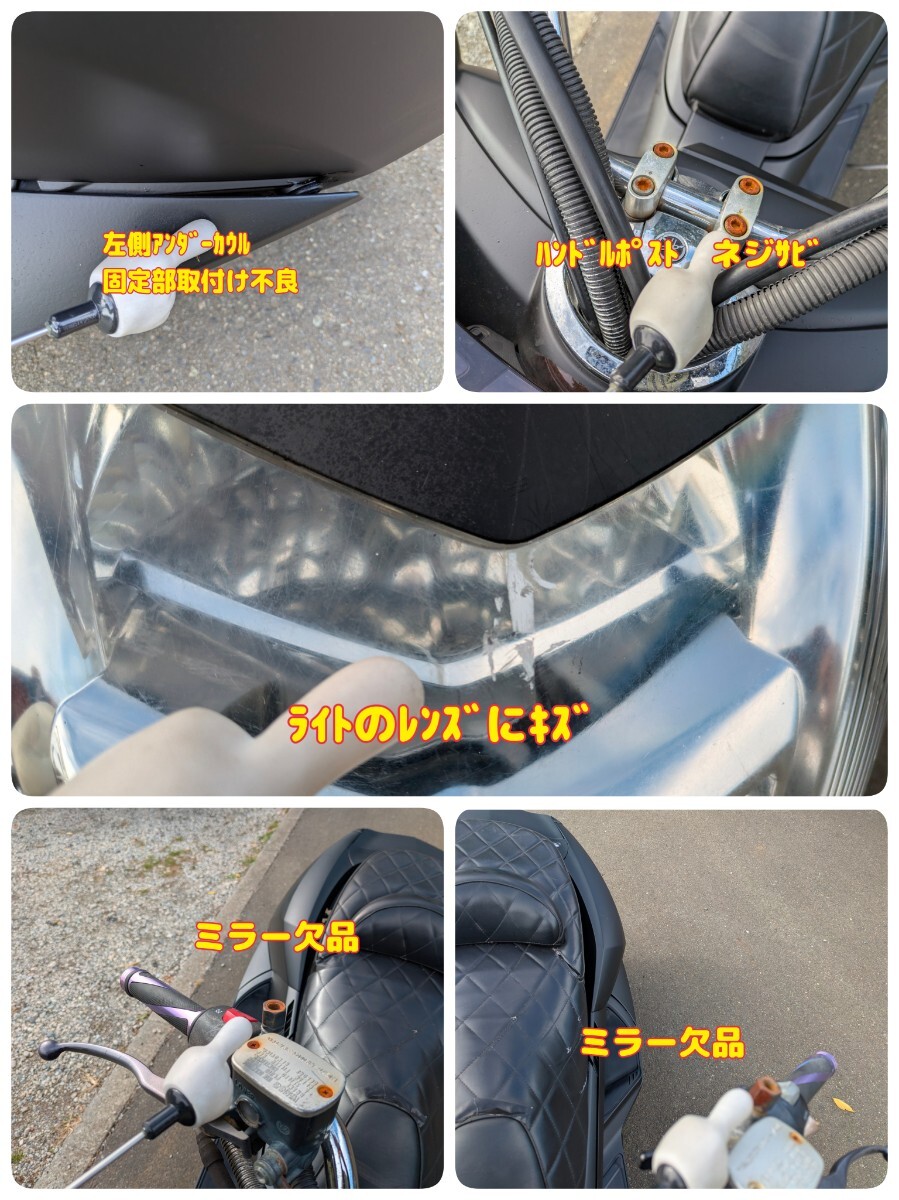 色替え(自家塗装)、塗装不良、各所傷、色褪せ、錆び、外装ヒビ、取付不良、ステッカー貼り、メッキくすみ、シート破れ、ほつれ、ウィンカーひび割れ、ウィンカーフィルム貼り、画像で分かりにくい傷有り(動画や現車確認にて)