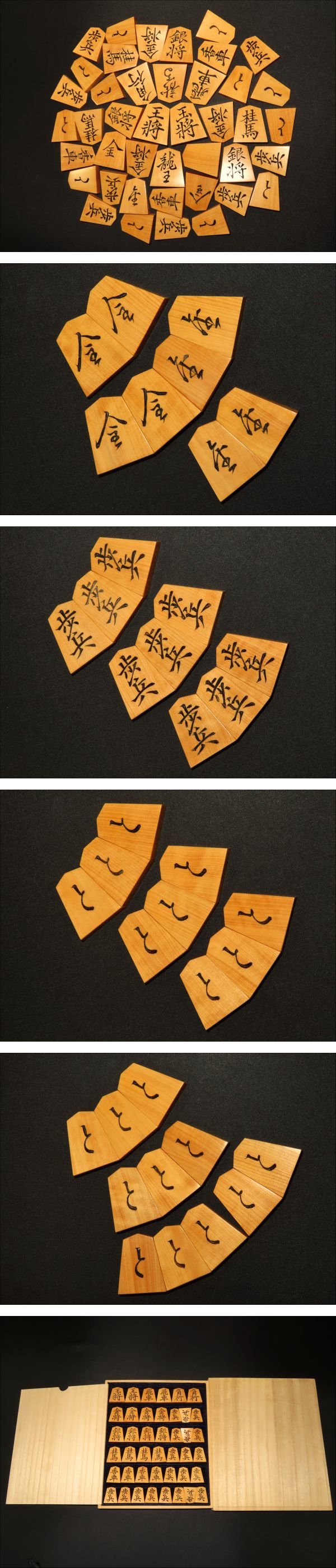 木地は御蔵島黄楊赤柾。ご覧の通り、虎杢に近い非常に味の良い木地です。全ての駒の表裏をUPしてございます。是非ご覧下さい。
