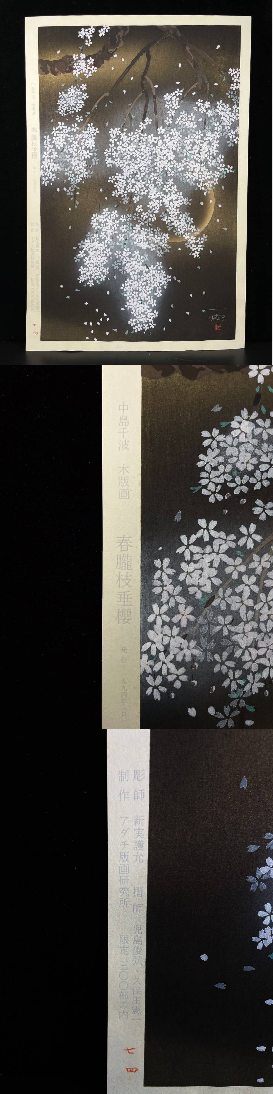 ◇雅◇ 真作保証 希少 中島千波 「春朧枝垂桜」 木版画 1994年 アダチ版画研究所 限定300部の内74 落款有 額装 箱付 /RG.25.11[C136] PW 收藏