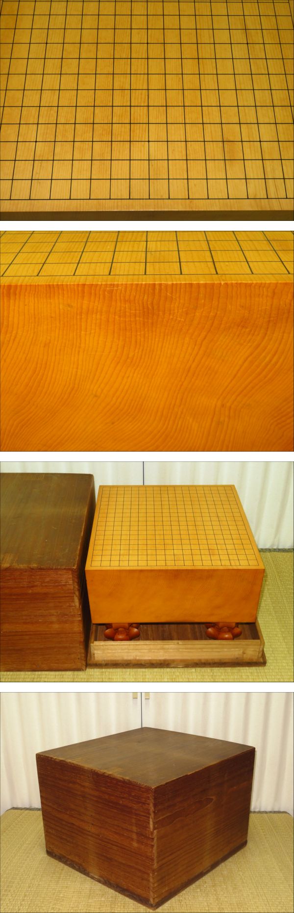 写真の桐総箱(盤全体を収納する箱/経年による変色等がございます)が付属いたします。盤覆・盤カバーは付属いたしません。