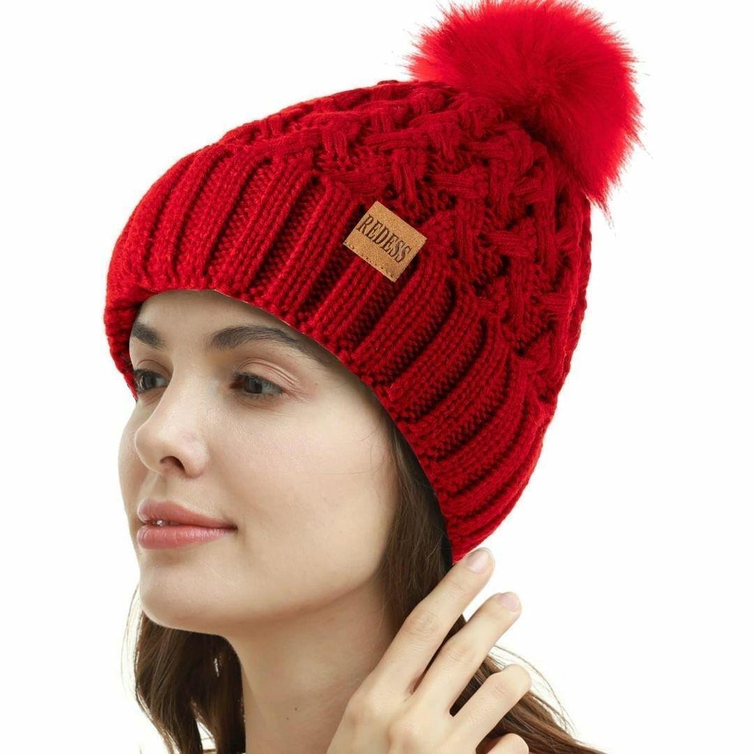 レディース 冬用ポンポン ビーニー帽 暖かいフリース裏地付き 赤 厚手 收藏
