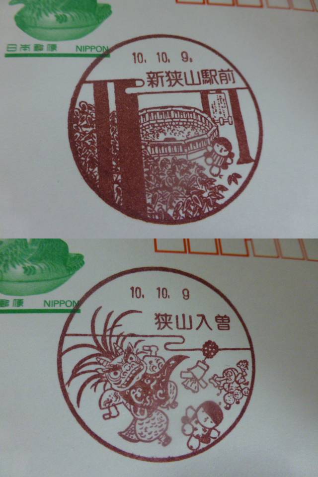 ☆鴛鴦はがき 初日風景印 埼玉2枚 新狭山駅前 H10.10.9・狭山入曽 H10.10.9 收藏