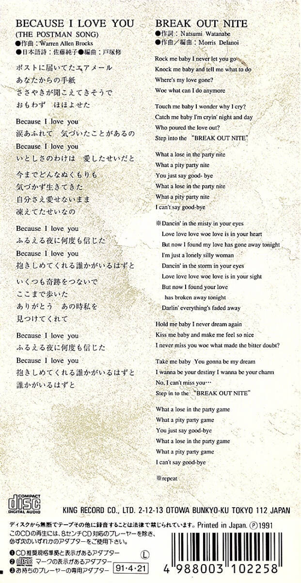 ◆8cmCD/短冊CD◆Satoko(清水咲斗子)「Because I Love You」Crystal Bird KIDS 40 c/w:「Break Out Nite」 收藏