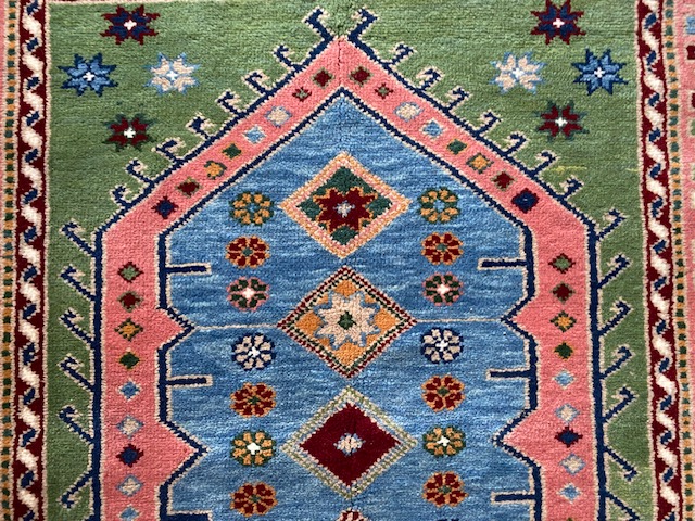 柄はコーカサス(カザック柄)と呼ばれる柄で、アゼルバイジャンの絨毯、キリムからヒントを得て織られた