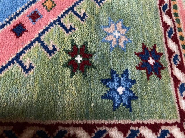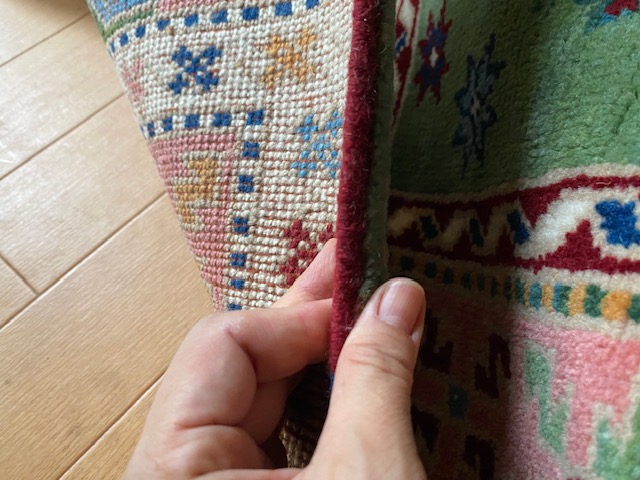 また手織りの特徴で白い結び目が表に出ている部分や、糸が出ているものなどもたまにありますが、こちらも手織りの絨毯の特徴で、その点についてはミスや織違いではありませんので、手織りの特性ということでご理解ください。