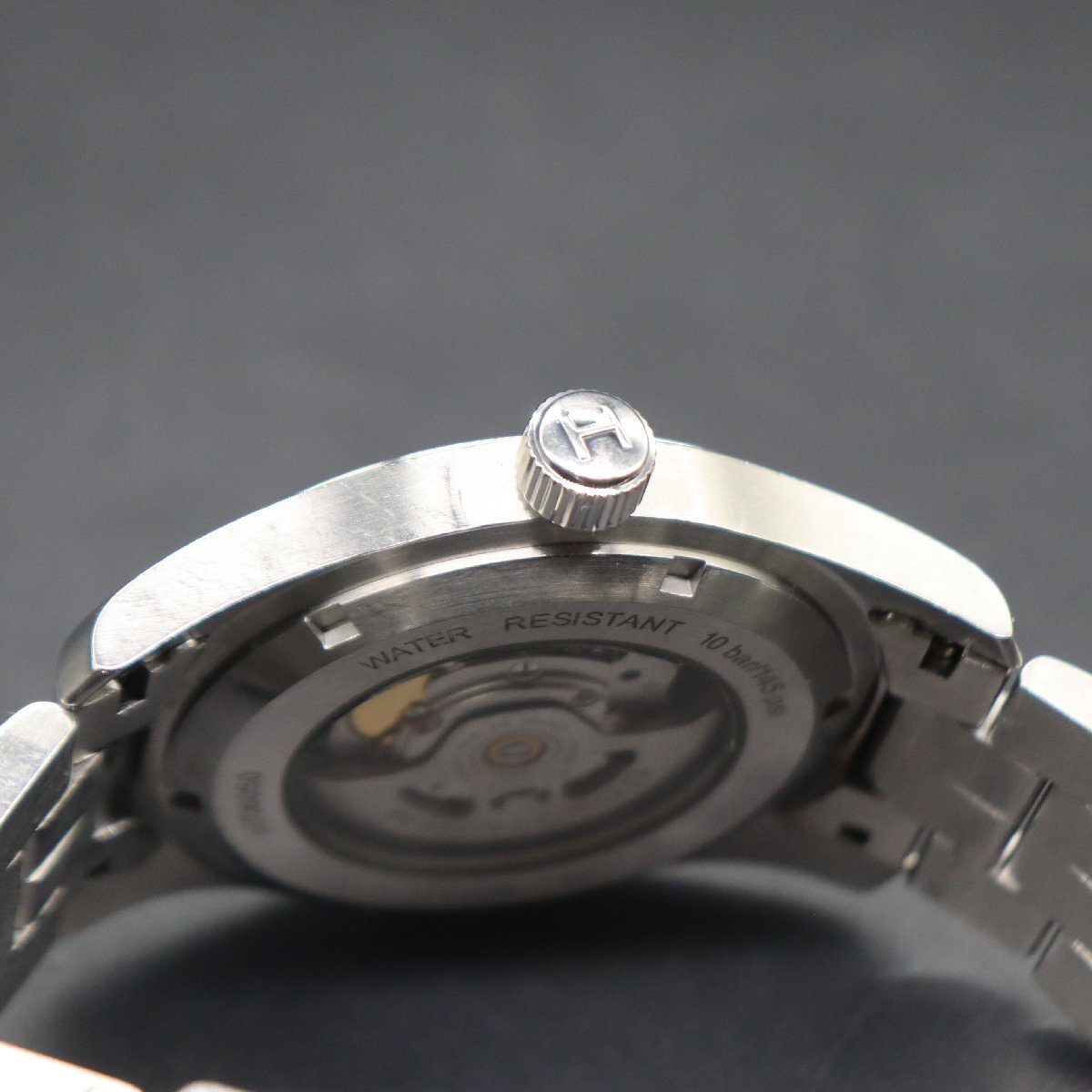 令和7年10月、当店専属の時計修理店(一級時計修理技能士)にてOH済みです。 平置きで24時間動作確認済み、±30秒以内で遅れなく稼働中です。 安心のメンテナンス済み商品ですので、すぐにお使い頂けます。 是非この機会にご検討くださいませ。 リューズ一段引きで日付早送り、二段引きで時刻調整が可能です。 ※カレンダー早送り機能は、商品同封の使用上の注意を必ず守り、 丁寧に、やさしく操作していただくようお願いいたします。 ケースに使用にともなうキズと打痕、ベゼルに小傷、 風防表面にわずかなスレ傷が見受けられますが ネイビー文字盤は目視で傷みなく、ダイヤルのきれいなお品です。 針・インデックス、良好です。 リューズ、Hマーク付き純正品です。 裏蓋スケルトン、薄い線傷ございますが全体に状態良く、 機械の動きを鮮明にお楽しみいただけます。 純正ブレス、全体にスレ傷、ラグ付近に打痕ございますが ほぼタレはなく、通常使用に問題ございません。 ロゴ付きバックル、開閉良好です。 経年のわりに全体としてはきれいなお品かと思います。 詳しくは画像にてご確認ください。 |