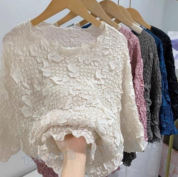 ☆新品 プリーツpLeatS 7分袖丈シャツブラウス花柄肌触り弾力ドレープ性いい合わせ安い柔らかい快適ブルー 收藏