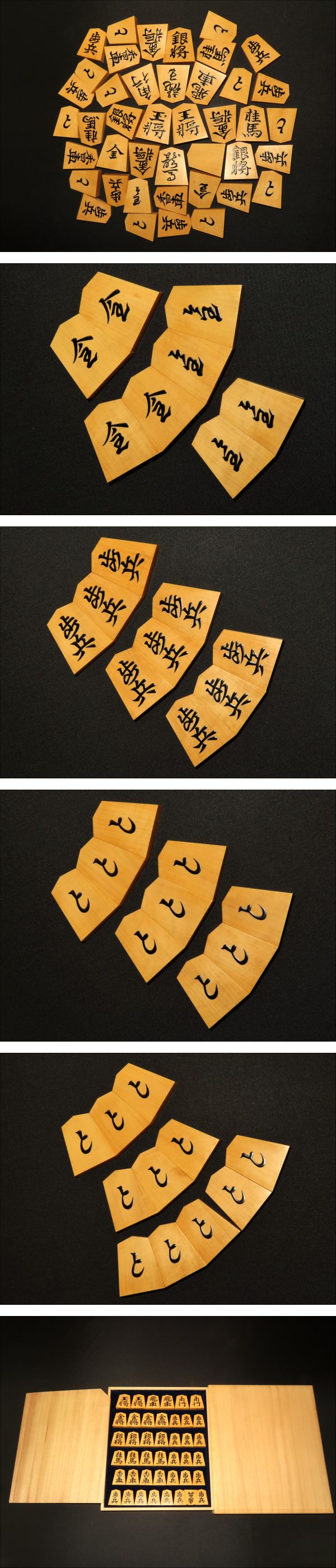木地は御蔵島黄楊上柾目。ご覧の通り非常に味の良い木地です。全ての駒の表裏をUPいたしました。是非ご覧下さい。