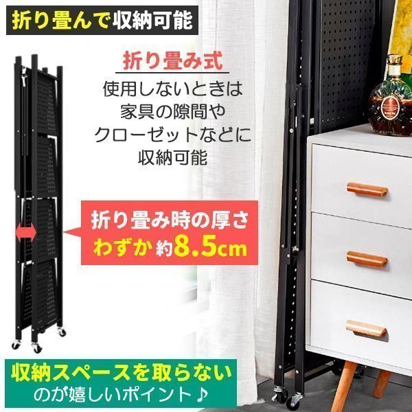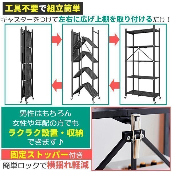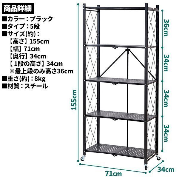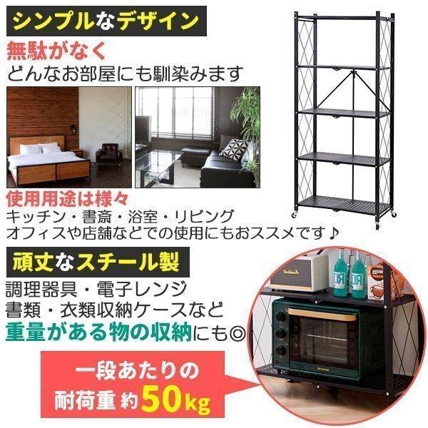 収納ラック 棚 金属シェルフ スチールラック メタルラック 折りたたみ 折り畳み スチール棚 キャスター付 組立簡単 頑丈 ブラック 黒 5段 收藏