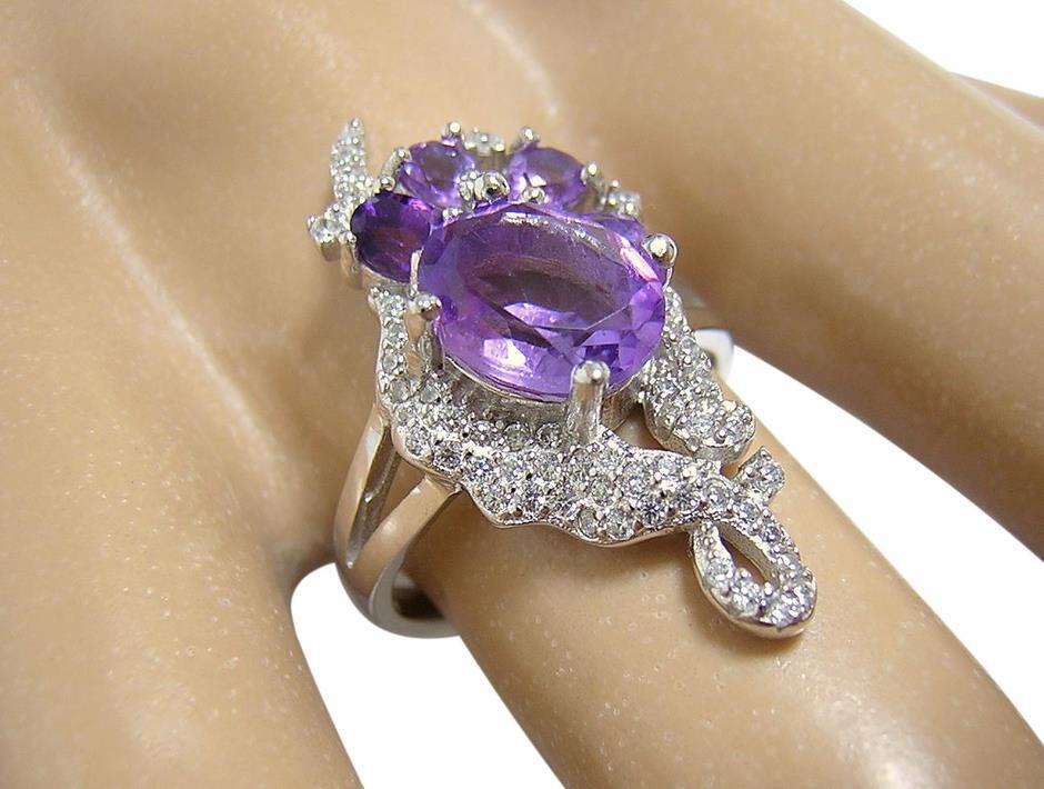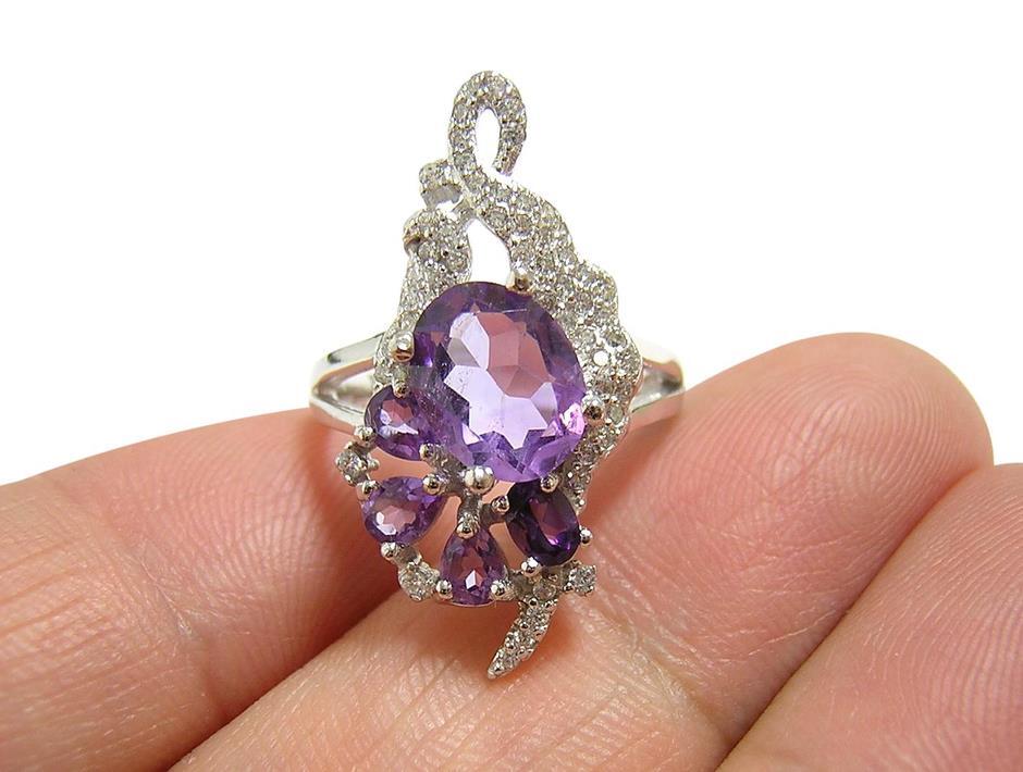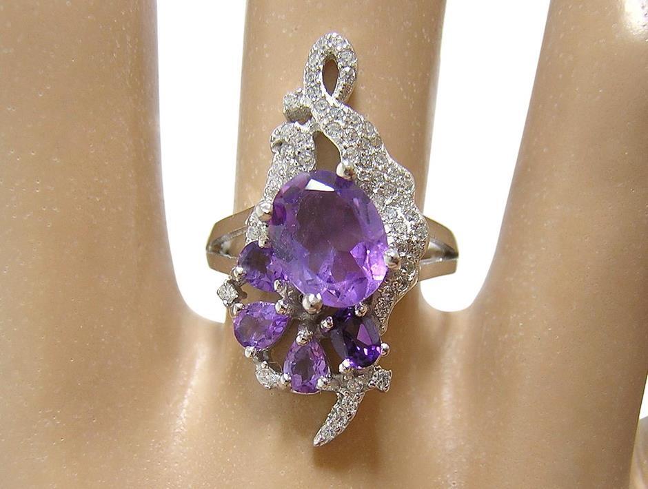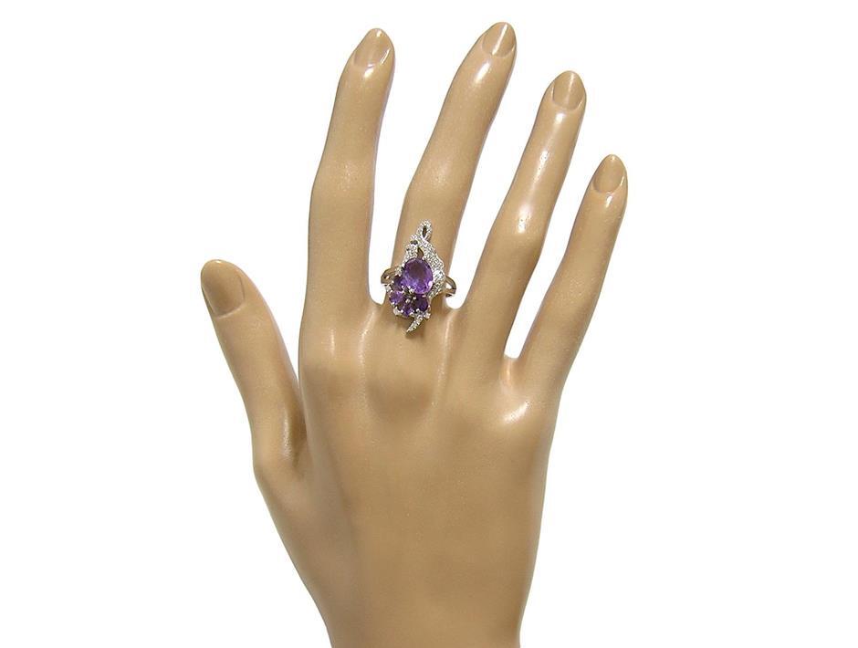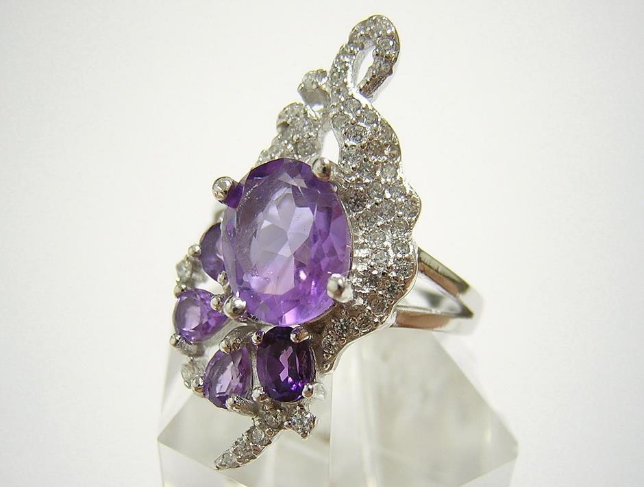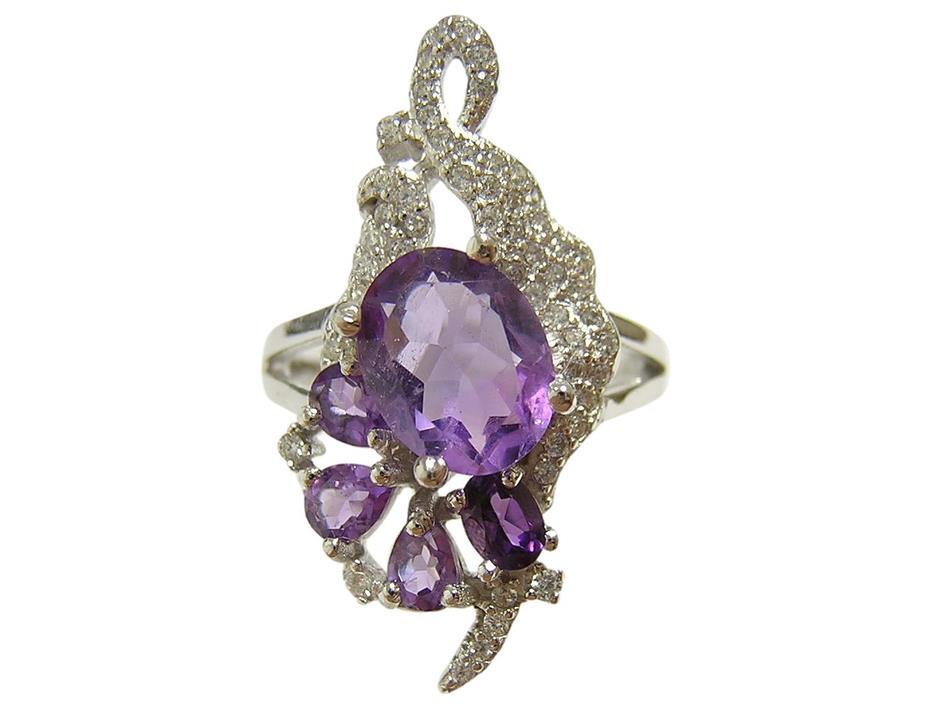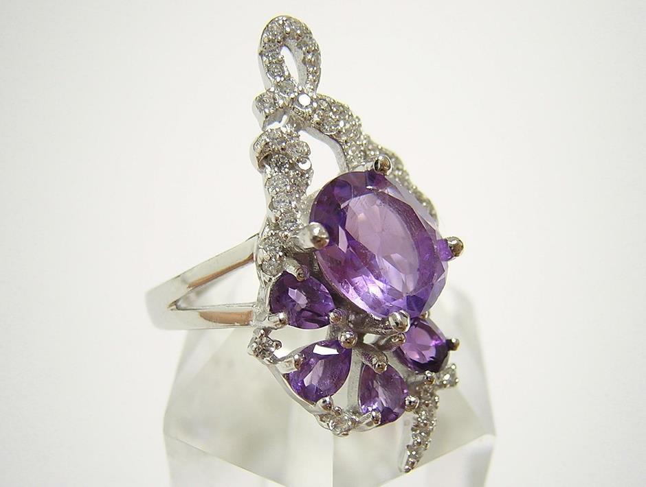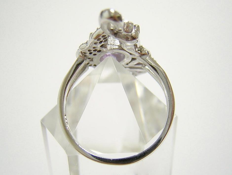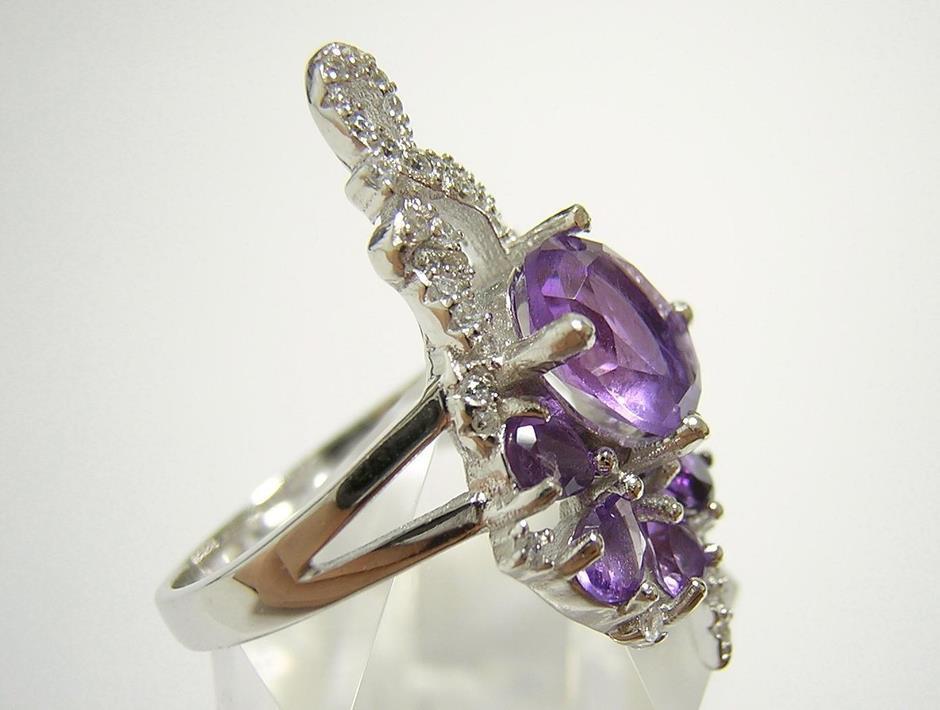 | 天然アメジストとキュービックジルコニアを使用したデザインリングです。 メインストーンの大きさは約9×7mmです。 【中石】天然アメジスト 【産地】ブラジル産 【処理】非加熱 【カット】オーバルファセットカット 【脇石】天然アメジスト、キュービックジルコニア 【重さ】4.5g 【サイズ】11.5号 (お直しは承れません) デザイン部:縦27mm×横18mm 【素材】シルバー925 (14金ホワイトゴールド仕上げ) 【刻印】925 【状態】新品 ※地金部分に製作時からの小傷やスレがあります。 | ||