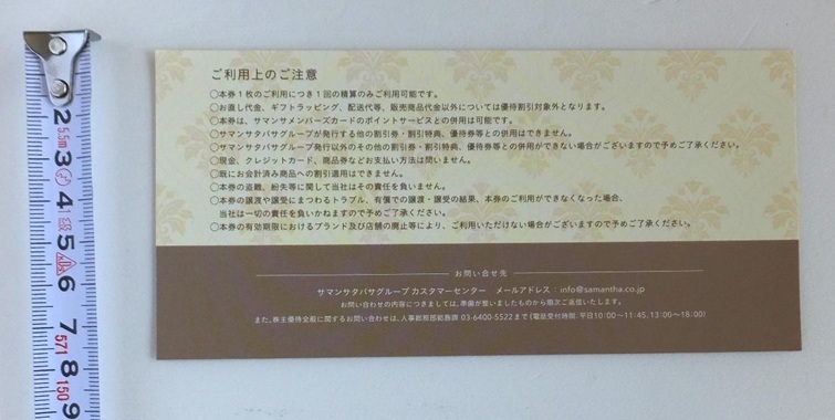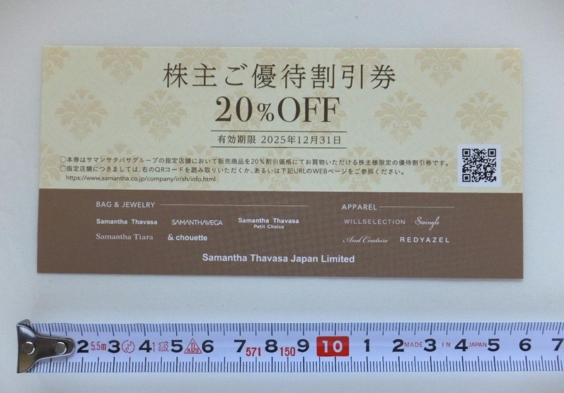 | 商品説明 | サマンサタバサ 株主優待券 20%割引 1枚 有効期限 2025.12.31 サマンサタバサグループの指定店舗で使用可能 ポイントカードのポイントサービス・他の割引券・割引特典 併用不可 家庭での保管品です。 気になる方は、入札ご遠慮ください。 整理番号 25205 |