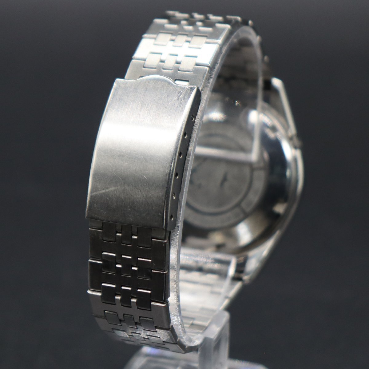 | 商品状態 | 平置きで12時間動作確認済み、大幅な遅れなく稼働中です。 リューズ一段引きで日付早送り、二段引きで時刻調整が可能です。 曜日早送り機能はございません。 ※カレンダー早送り機能は、商品同封の使用上の注意を必ず守り、 丁寧に、やさしく操作していただくようお願いいたします。 全体に経年のキズや汚れ・小打痕、目立ちませんがデイトに小シミ、 風防に爪にかからない程度の薄いキズございますが、 ダイアルの視認性は十分に保たれております。 文字盤は微細なチリ・小傷み、針に小キズがある程度で 目視で目立つ傷みはなく、全体としては良好です。 インデックス・植字ロゴ、良好です。 経年のわりに比較的状態が良くキレイなお品かと思います。 裏蓋はキズ少なく、イルカ王冠マーク、刻印鮮明です。 ブレスはスレ傷などやや使用感ございますが、概ね良好です。 バックルしっかり閉まります。 状態について、詳しくは画像にてご判断願います。 | |