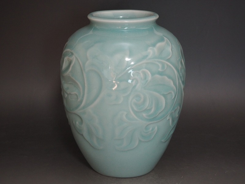 | B1957 陽刻唐草文 青磁花瓶 ☆ 高23㎝ 花道具 華道具 茶道具 花器 花瓶 花入 花生 花活 飾壷 飾壺 フラワーベース 陶器 美品 良品 無傷 | ||