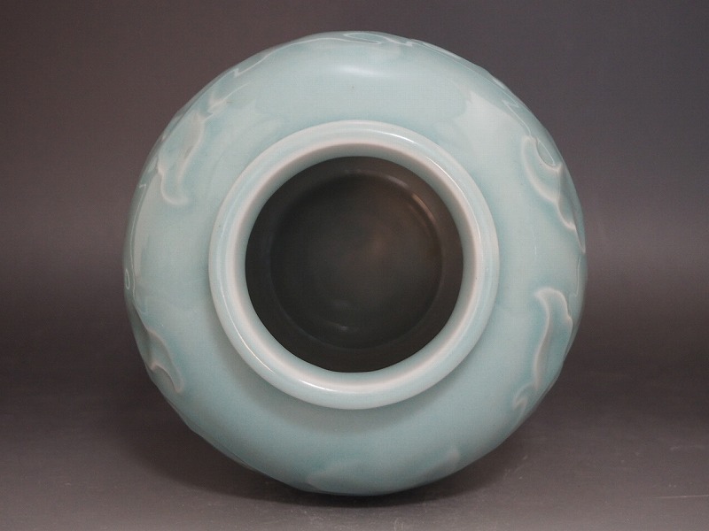 B1957 陽刻唐草文 青磁花瓶 ☆ 高23㎝ 花道具 華道具 茶道具 花器 花瓶 花入 花生 花活 飾壷 飾壺 フラワーベース 陶器 美品 良品 無傷 收藏