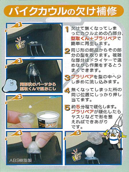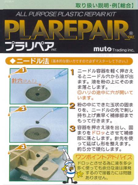 | 商品説明 | プラスチック製品の割れ・折れを修繕・補強(リペア)するための製品です。 専用の”粉”と”液”を混ぜて硬化させます。 数あるプラリペアのラインナップのなかで、PK-200は中級者以上のセットです。 特に、初心者用のPL-16やPK-16で熟練度を高めた方にオススメです。 また、はじめて購入するという方でも 「おおよそ使い方のイメージがつかめている」 「あらかじめ多めに分量が必要」 という方に最適の製品です。 利用例をご用意いたしました、参考になさってください。 ※プラリペアシリーズの他の製品の例も含まれております、ご注意ください。 【セット内容】 プラリペアパウダー(青):100g プラリペア専用リキッド:100mL 専用ニードル スポイト リキッド用容器 小分けカップ 型取くん3本 ガラスクロス 取り扱い説明書 車の部品の修正などに最適な量です。 修理する部品の色に合わせてお選び下さい。 ・割れ、折れ、欠けの接着剤で困っていませんか? ・模り(かたどり)も出来るプラリペアです。 ・車のパーツの修復、オートバイのカウル、ねじ穴の修復、おもちゃ、 パソコンなどあなたの大切な物の修復にプラリペアは欠かせません。 ・諦めてしまう前にぜひ、一度お試し下さい。 ・【プラリペアの長所】 ・エポキシ系より硬化が早く5分で固まります。 ・使いやすいので、なんでも修理したくなります。 ・瞬間接着剤など一度使ってまた使うとき中身が固まって使えないなんて経験ないですか? ・プラリペアは、粉と液の必要な分だけ使えます。 ・固まるとアクリル樹脂なので強度もバッチリです。 ・強度が強くノートパソコンなどのヒンジ部分もOK! ・硬化が早く5分で固まり仕事が速く進みます。 ・接着でのご使用でしたら少しの量で、経済的です。 ・必要な分量だけ混ぜて使いますので、長期保存可能です。 |