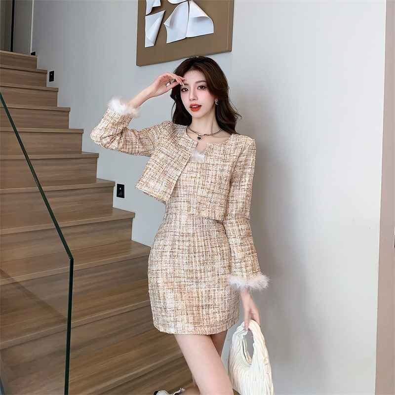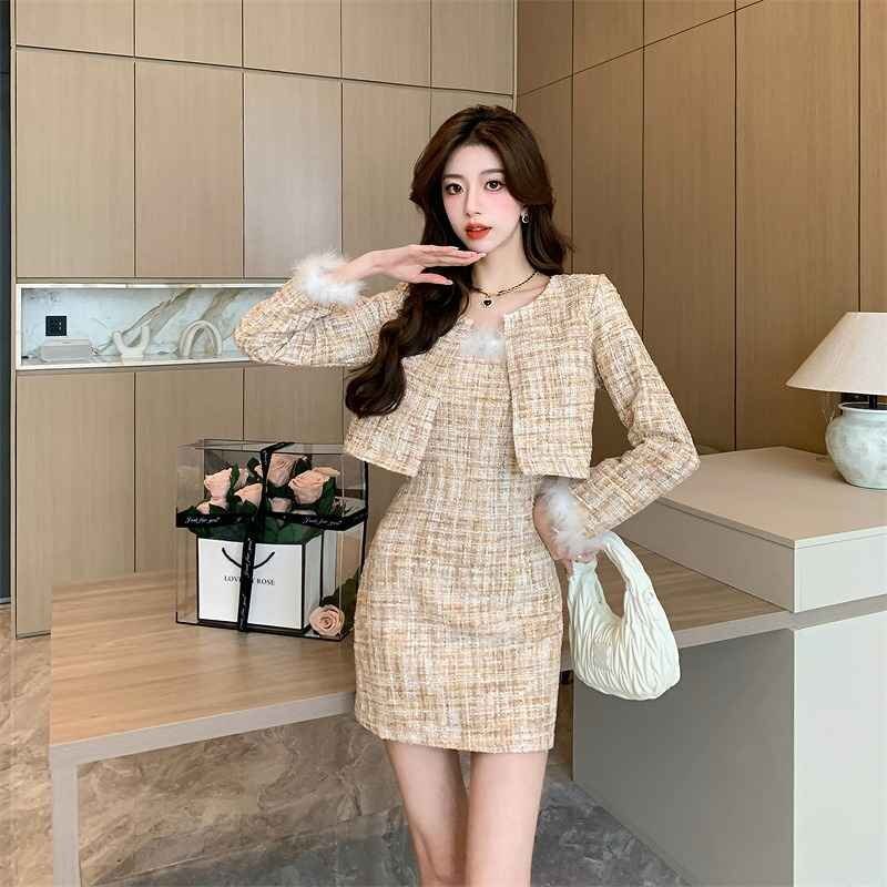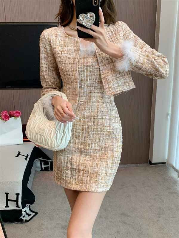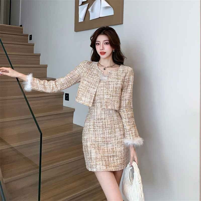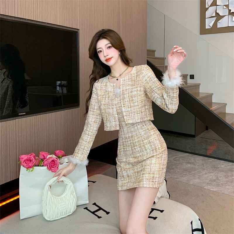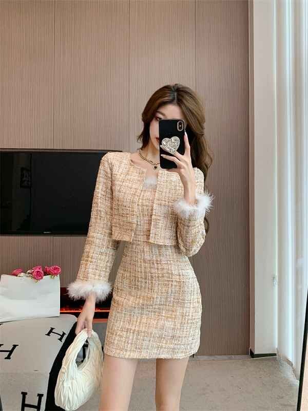 上下セット 2点セット タイトスカート+長袖ジャケット ミニスカート きれいめ かわいい フェイクファー 秋冬 セットアップ M ベージュ 收藏