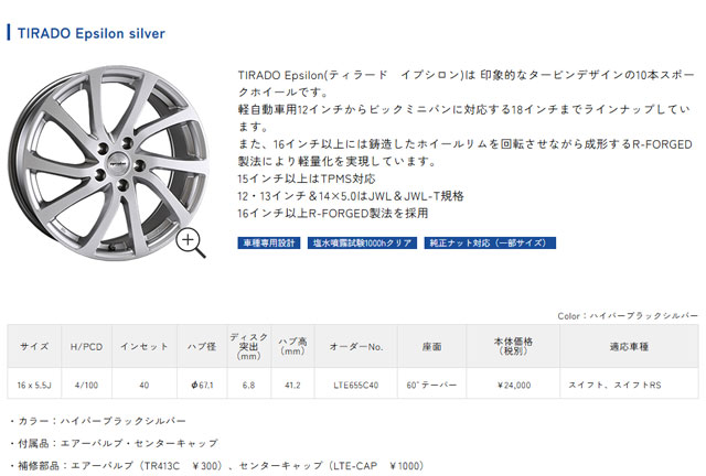 LA STRADA(阿部商会) アルミホイール4枚セット TIRADO Epsilon silver LTE655C40 を出品いたします。 ■特徴■ TIRADO Epsilon(ティラード イプシロン)は 印象的なタービンデザインの 10本スポークホイールです。 鋳造したホイールリムを回転させながら成形する R-FORGED製法により軽量化を実現しています。 スズキ・スイフト、スイフトRSなどに。 (年式やグレードにより適合しない場合もございますので、 入札前にディーラーやメーカーに直接お問い合わせ下さい。) メーカーHPもご覧ください 箱に若干傷みはありますが、 実使用のない未使用品です。 写真に写っているものが全てのセット品です。 発送は佐川飛脚宅配便でお送りします。 別途送料が発生します。 上記「発送の注意」をご確認ください セットで定価96,000円の非常に高価な商品です。 格安出品いたしますのでこの機会をお見逃しなく! |