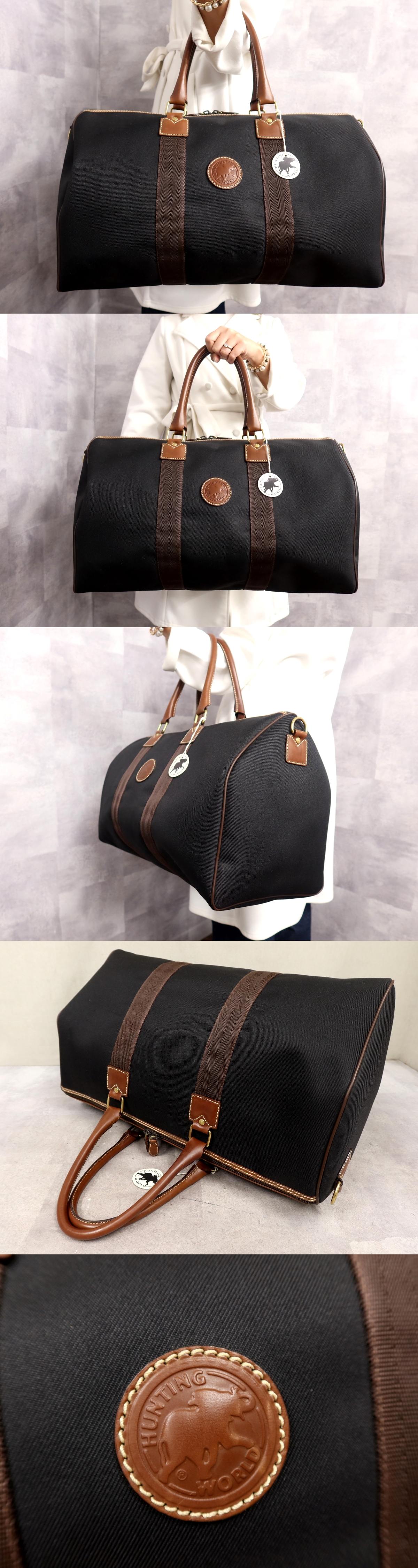 ●超美品●HUNTING WORLD ハンティング・ワールド●ナイロン カーフ レザー 本革●ボストン バッグ●黒 ブラウン●ゴールド金具●Js63633 收藏