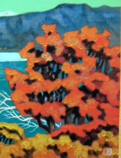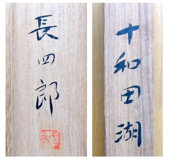 「真作」日本画 平岩長四郎 作 「 十和田湖 」肉筆掛軸 共箱 收藏