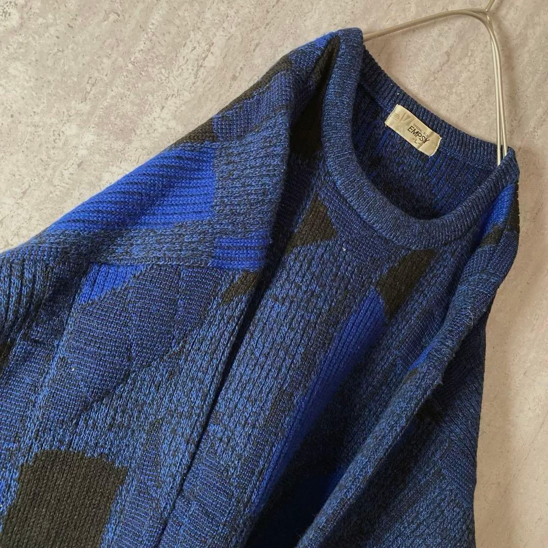 ヴィンテージ 総柄ニット 肉厚 デザインニット 太アーム ブルー ブラック 日本製 收藏