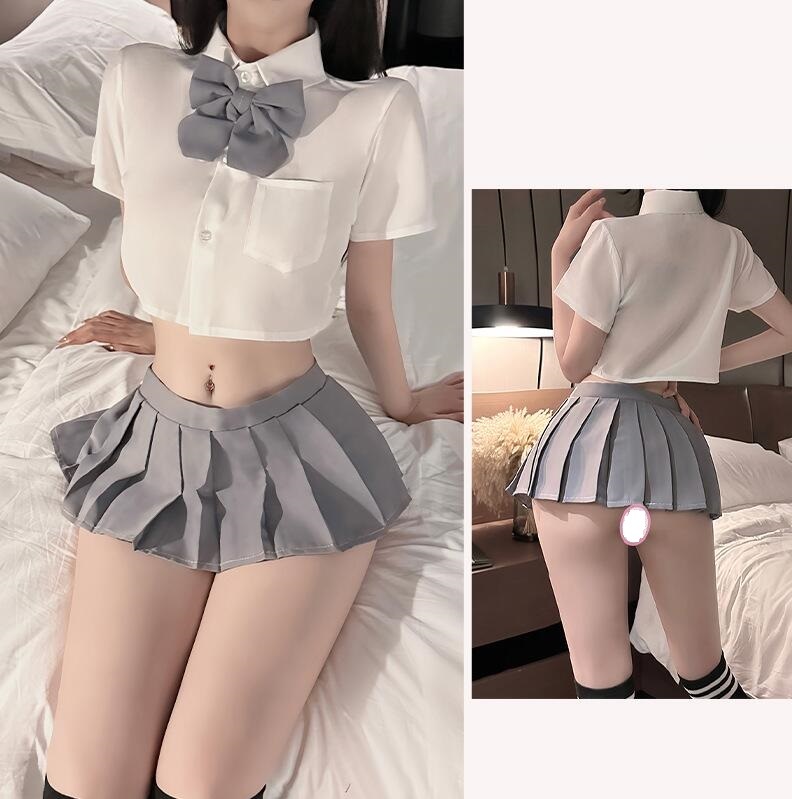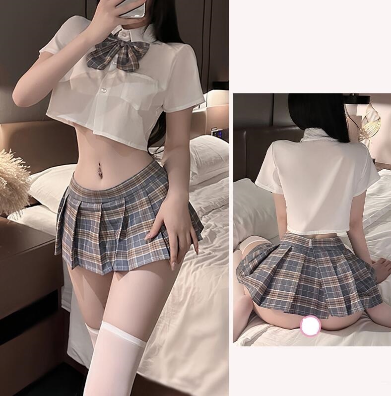 新品* セクシー 2点セット コスチューム 露出系 チェック柄 プリーツ マイクロ ミニ スカート ウエストゴム エロ コスプレ * ネイビー 收藏