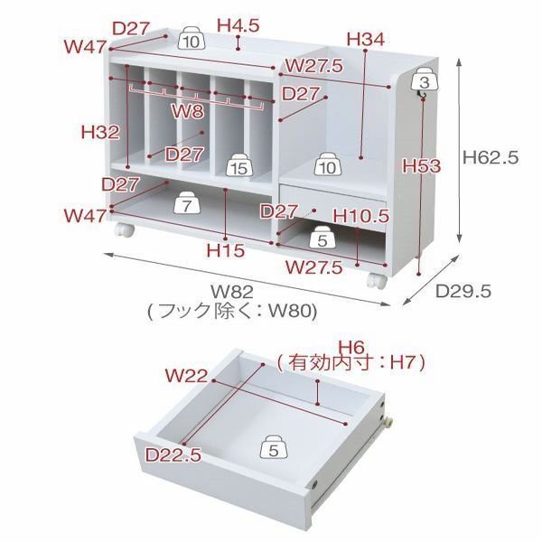 | 【カラー】 ナチュラル、ホワイト 【サイズ】 <外寸> 幅82×奥行29.5×高さ62.5cm <内寸> 左上段オープン部:幅47×奥行27×高さ4.5cm 整理棚各部:幅8×奥行27×高さ32cm 左下段オープン部:幅47×奥行27×高さ15cm 右上段オープン部:幅27.5×奥行27×高さ34cm 引き出し:幅22×奥行22.5×高さ6(有効7)cm 右下段オープン部:幅27.5×奥行27×高さ10.5cm フック:出幅2cm フック下:高さ53cm 【材質】 プリント紙化粧合板 【耐荷重】 天板:10kg以下 オープン部上部右:10kg以下 整理棚:15kg以下 引き出し:5kg以下 オープン部下部左:7kg以下 オープン部下部右:5kg以下 フック:3kg以下 【生産国】 ベトナム 【梱包】 サイズ:85×64×10cm、重量:19.3kg 【その他】 ・背面化粧有り ・キャスター5個(うち2個ストッパー付き) ・フック2個付き 【組み立て品】 お客様による組み立てが必要です。 【ご注意】 ・サイズ、重量は概算です。 ・商品カラーはご使用のモニターによって実際の明るさや色と異なって見える場合がございます。 |