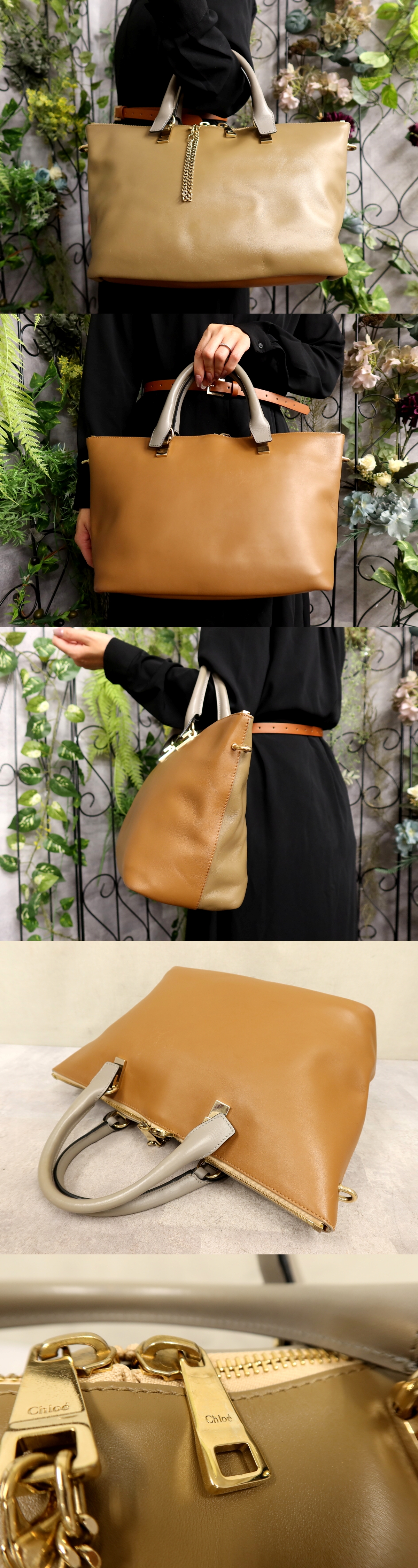 ●超美品●Chloe クロエ●ベイリー●カーフ レザー 本革●ハンド バッグ●ブラウン系 グレー●ゴールド金具●A4 書類 収納 かばん●Js61523 收藏