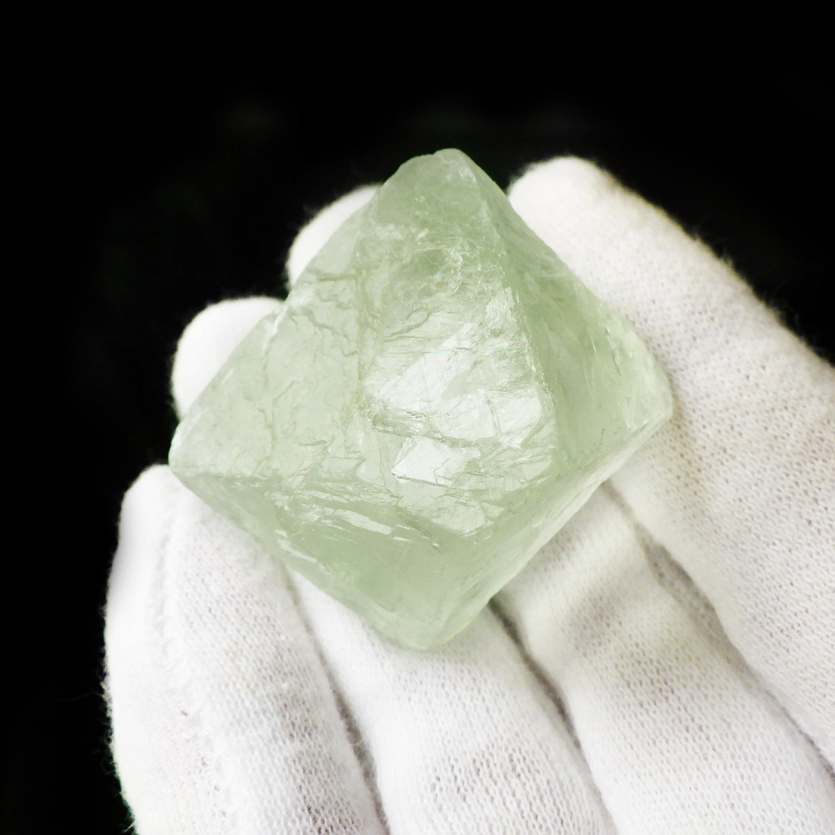 チャイナ産の八面体フローライトです。この正八面体の形は、蛍石が平面に平行に割れやすい性質を利用して加工したものです。光に透かすと一層の美しさです。