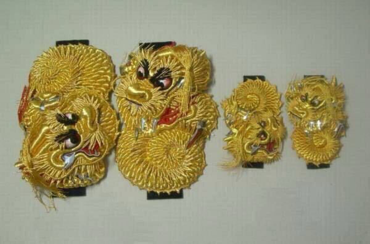 ★★★大感謝祭!数量&期間限定大特価キャンペーン中!!!!★★★ 大感謝祭セール!日頃の感謝の気持ちを込めて数量&期間限定の大特価で出品中!!! この度は多くの出品の中より当オークションをご閲覧いただきまして誠にありがとうございます。 ただ今、当方では、より多くの皆様に金糸刺繍製品の魅力をお伝えできますように、 数量&期間限定ではございますが、特別大特価で出品させて頂いております。 価格面や特注製作等、細やかなご要望にもできる限りお応えさせていただきますので ご入札前にご質問欄よりご遠慮なくお申し付けくださいませ。 通常、一般には出回ることがほとんどない、入手が大変難しいお品です。 この機会に是非ともたくさんの皆様にご入札いただけますように、心よりお待ちいたしております。 【ご注意とお願い】 ご予約状況により、納期は数ヶ月、場合によっては1年前後お待ち頂いております。 ご不便をおかけし誠に申し訳ございませんが、ご了承いただける方のみご入札いただけますようお願い致します。 ★ご覧いただきましてありがとうございます。 この度、ご紹介させていただきますお品は、 刺繍職人が一針一針、丹精込めて縫い上げた金龍刺繍、阿吽(あうん)の超特大金龍一対です。 全長が約600mmもある超特大サイズですので中型または子供用の太鼓台や、ちょうさ、屋台、山車、だんじり等、(地域によって呼び方は色々です) 、地域によっては親太鼓にも十分にご利用いただけるサイズになります。 出品内容は、阿形の龍×1体と、吽形の龍×1体の合計2体で1対の価格が入札単位になります。 1体のみの価格ではございませんのでどうぞご安心ください。 龍は古来より、二頭が一対となって「阿吽」を表すことにより、邪気を追い払う力が備わると言い伝えられております。 本作品は、通常サイズより二回り大きいサイズの大変貴重な超特大サイズです。 通常サイズの約3倍近くもある大きさで特別に製作いたしておりますので大変大きく厚みもあり、重量感もたっぷり!驚きの大迫力です。 金龍には全面にわたり、高級金糸が惜しみなくふんだんに使用されており、職人の技量が試される立体的な龍の造形を 生き生きとした表情で表現された、まるで生命を宿しているかのような見事なまでの表現力で製作された至極の逸品です。 *18金や24金の他、オリジナル素材やオリジナルデザインなど、特注製作も承っておりますのでお気軽にお申し付け下さい。 *標準仕様はソフト金です。 数十、数百年もの古来日本から伝わり、数十、数百年後も変わらず受け継がれていく伝統的で大変貴重な芸術品です。 お祭りやだんじり、太鼓台好きの方をはじめ、進学やご卒業、就職やご結婚などの記念などに、 未来永劫、連綿と続く繁栄のシンボルや家宝として、是非ともご検討くださいませ。 ・刺繍職人により、丹精込めて一針一針縫い込んで製作された貴重なお品です。 ・鱗(うろこ)は一枚一枚を丁寧に盛り上げて作成する、非常に繊細で大変な手間暇の掛かる、連続鱗製法です。 一枚鱗製法と同じく、一枚一枚丁寧に盛り上げて造形していくため、職人の技術と膨大な手間隙のかかる製法です。 ・立体感にも大変こだわって製作されておりますので十分な厚みがあり、とても迫力のある作品に仕上がっております。 ・牙と爪も既製品ではなく金物職人によるこだわりの手作り品です。 *全国各地の祭礼団の方、祭礼用品販売業者の方をはじめ、画家、デザイナー、アーティスト、クリエイター、 イラストレーター、個人製作者の方々へ、各種オリジナル製作からキャラクター物まで、ご予算、ご要望に応じた特注製作を承らせていただいております。 一点物から大量生産、簡単なものから高度な技術を要するご注文、細部にまでこだわった製作等、 あらゆるご要望にもできる限り対応させていただきますのでお気軽にお問い合わせくださいませ。 現在、金の相場が世界的に異常なほどの高騰を続けております。 金糸刺繍製品も例に漏れず原材料の原価が高騰しておりますので、現在、同じものを制作するとなると、驚くような高価格になってしまいます。 特に18金、24金金糸を使用した阿吽の金龍は、現在のような価格では二度とご提供できないかも知れません。 表題に1点限りと表記された作品は、在庫は一対のみ、または一点ものの大変貴重なお品になります。 また、再製作には、まとまったロット数が必要になるため、実質的には今回の出品が最後になる場合がございます。 大変貴重な作品になりますのでこの機会に是非どうぞ。 ・一番お安い値引きをご希望の方は質問欄よりメールアドレスと共にご一報下さい。 ★龍(竜)について 龍は古来より、仕事運やお金、家庭運や健康運、恋愛運など、あらゆる運気を呼び込むといわれており、 日本や中国はもとより、世界各国でも置物や絵画など身近に飾られて珍重されてきました。 また、風水では金色は金運や財力をアップすることでも有