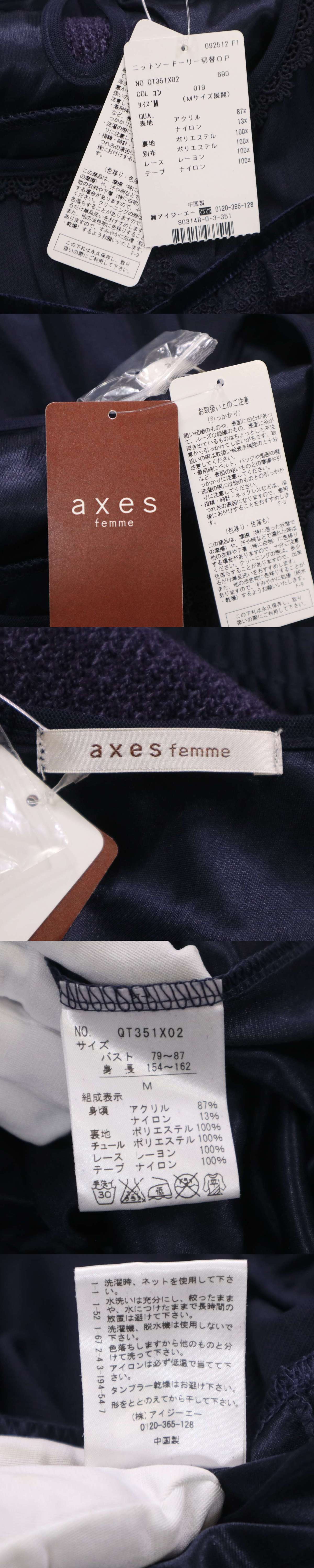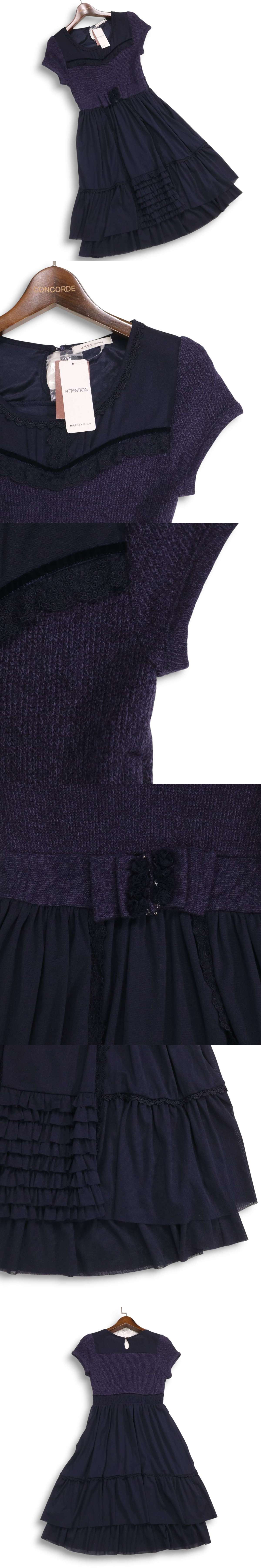 【新品 未使用】 axes femme アクシーズファム フリル♪ ニットソー ドーリー 切替 ワンピース Sz.M レディース ネイビー 收藏